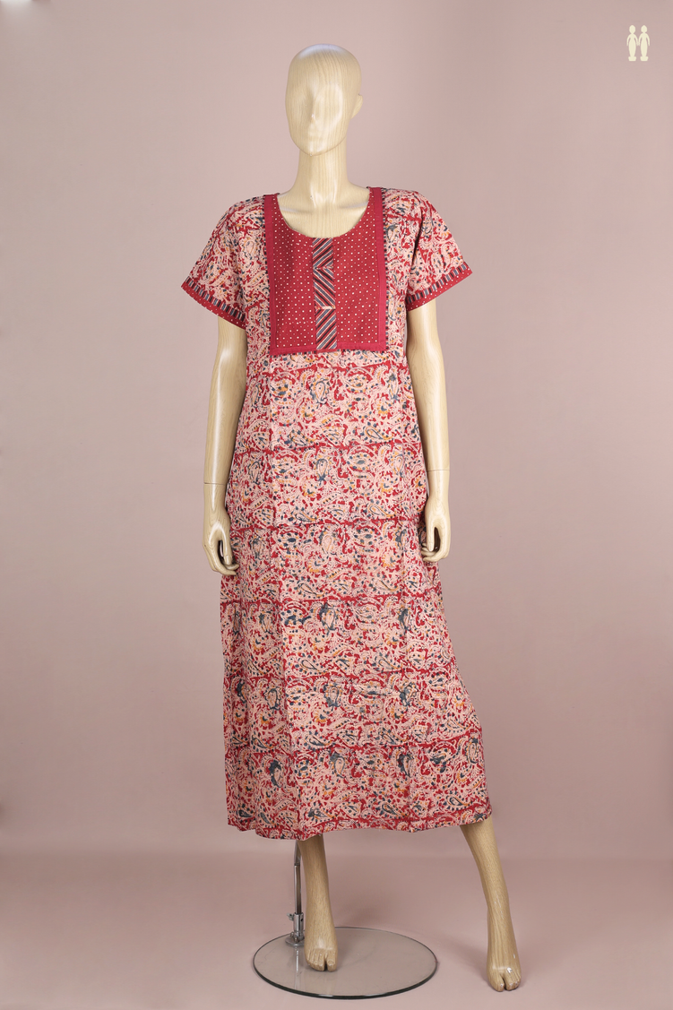 Experience comfort and elegance with this red cotton nightie featuring a refined round neck and delicate printed design. Crafted from breathable cotton, it ensures a soft touch against the skin, making it perfect for restful nights. Its sophisticated style combines simplicity with subtle charm, offering both relaxation and grace in your nighttime wardrobe.