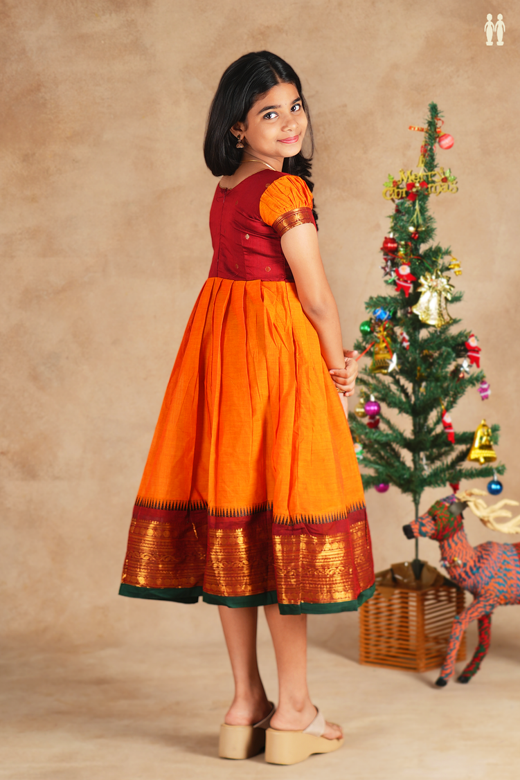 Round Neck Zari Buttas Red And Yellow Cotton Frock
