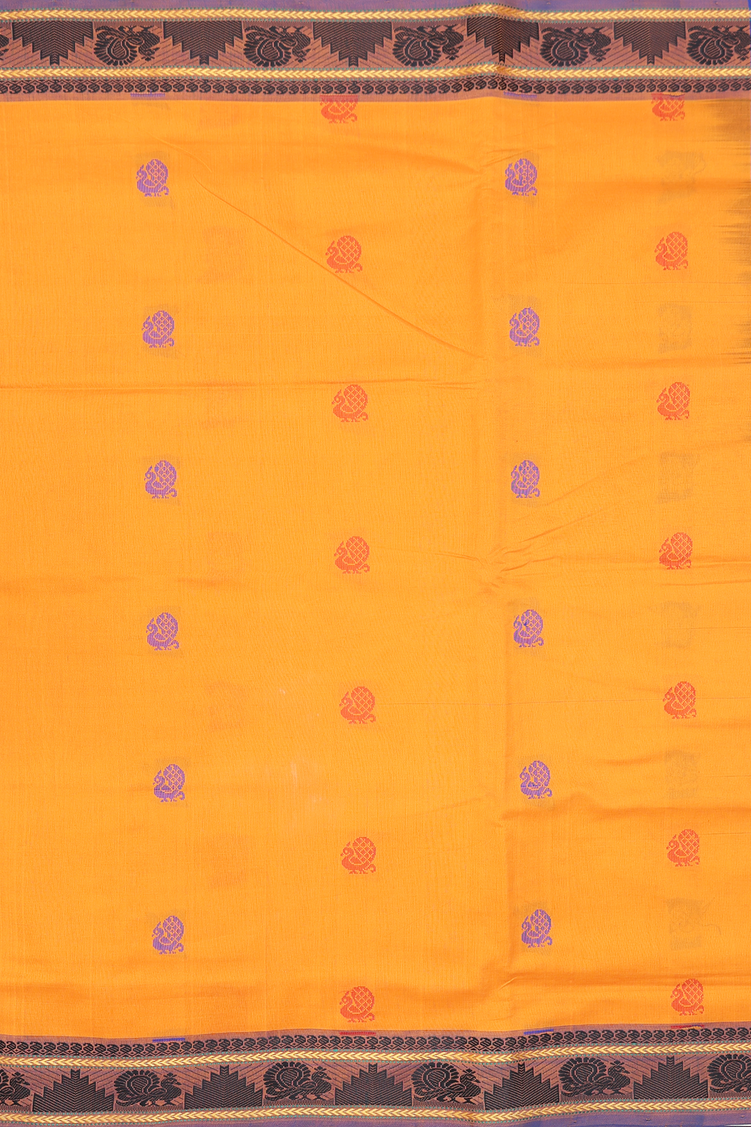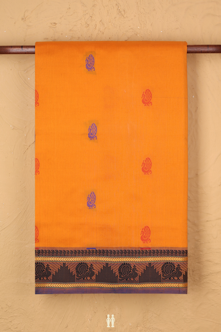 Semi Silk Cotton Saree In Orange With Peacock Buttas