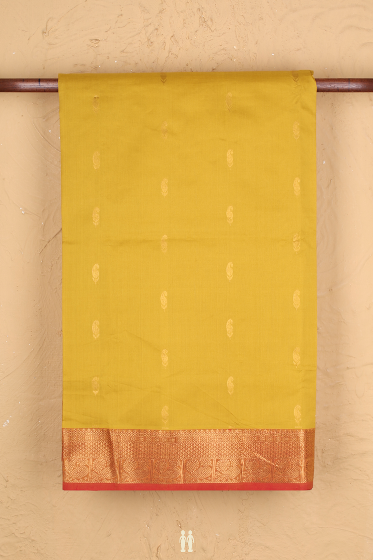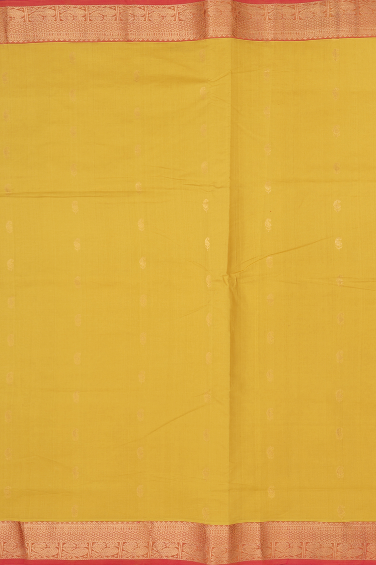 Silk Cotton Saree In Mustard Yellow With Paisley Buttas