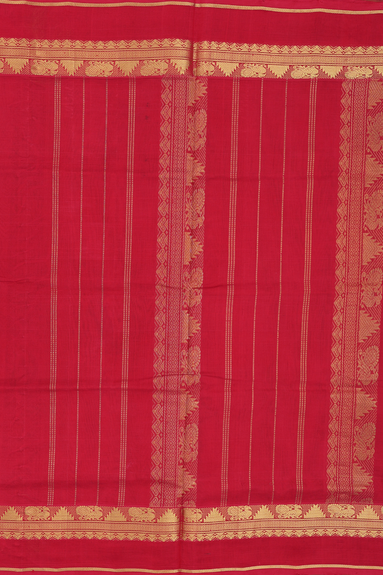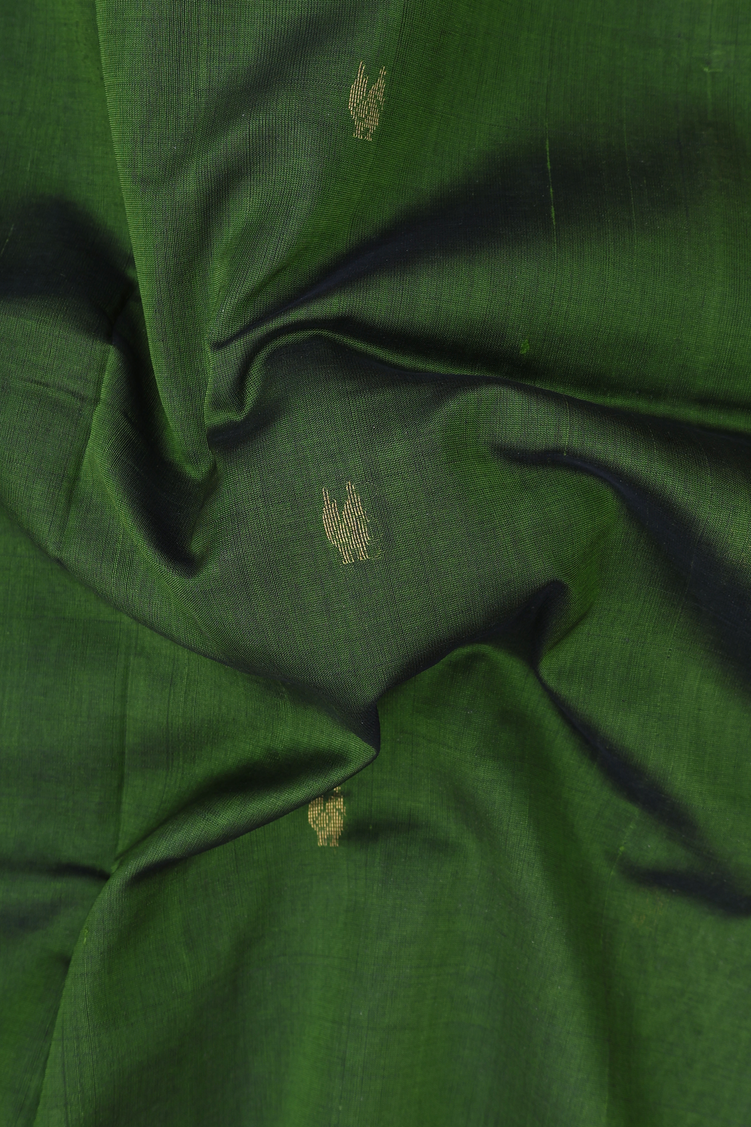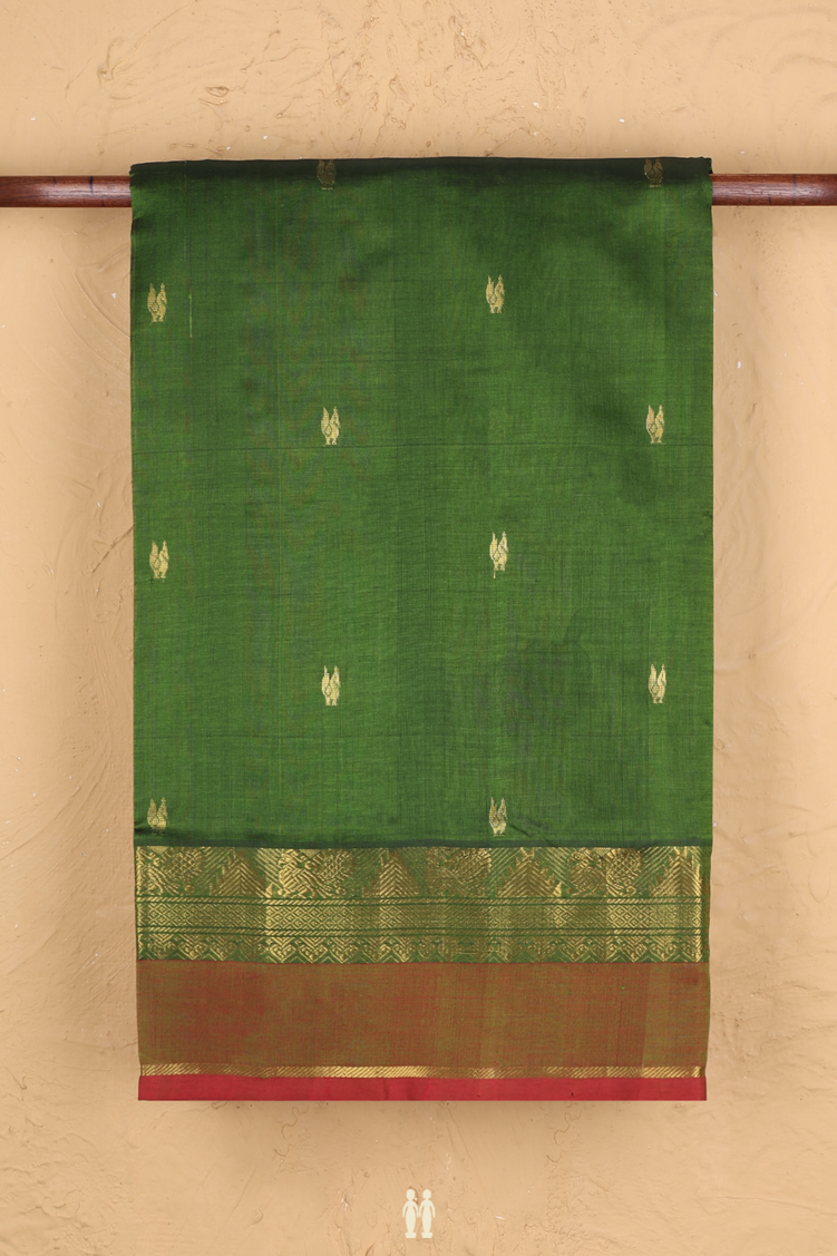 Silk Cotton Saree In Olive Green With Peacock Buttas