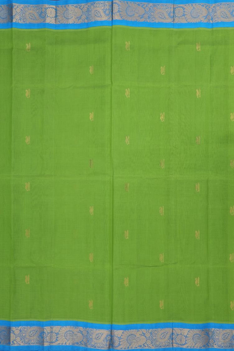 Silk Cotton Saree In Parrot Green With Paisley Buttas