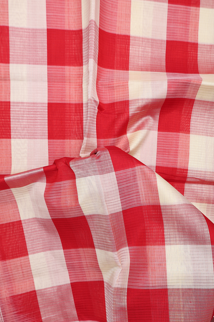 Experience timeless elegance with this silk cotton saree in white and red, featuring a classic checks design. The blend of traditional silk and cotton offers a graceful drape with a subtle sheen, ensuring comfort and style throughout the day. Perfect for both formal occasions and festive celebrations, this saree combines tradition with a contemporary touch for a sophisticated look.
