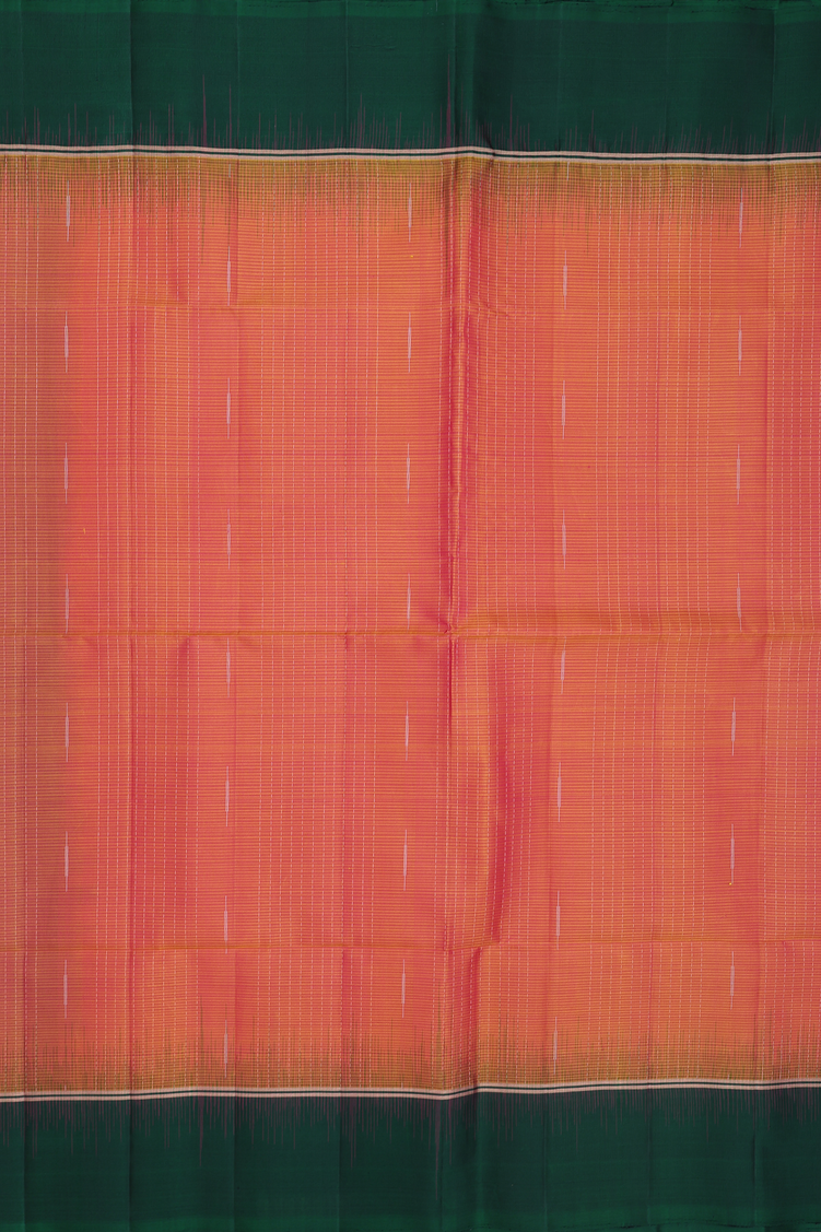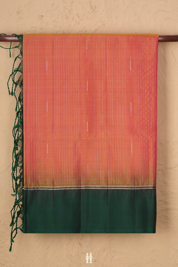 Drape yourself in elegance with this stunning soft silk saree in vibrant coral orange. The saree features a refined striped design that adds texture and movement to your silhouette. A striking forest green contrast border frames the piece beautifully, creating a sophisticated color play that works for both festive occasions and everyday celebrations.