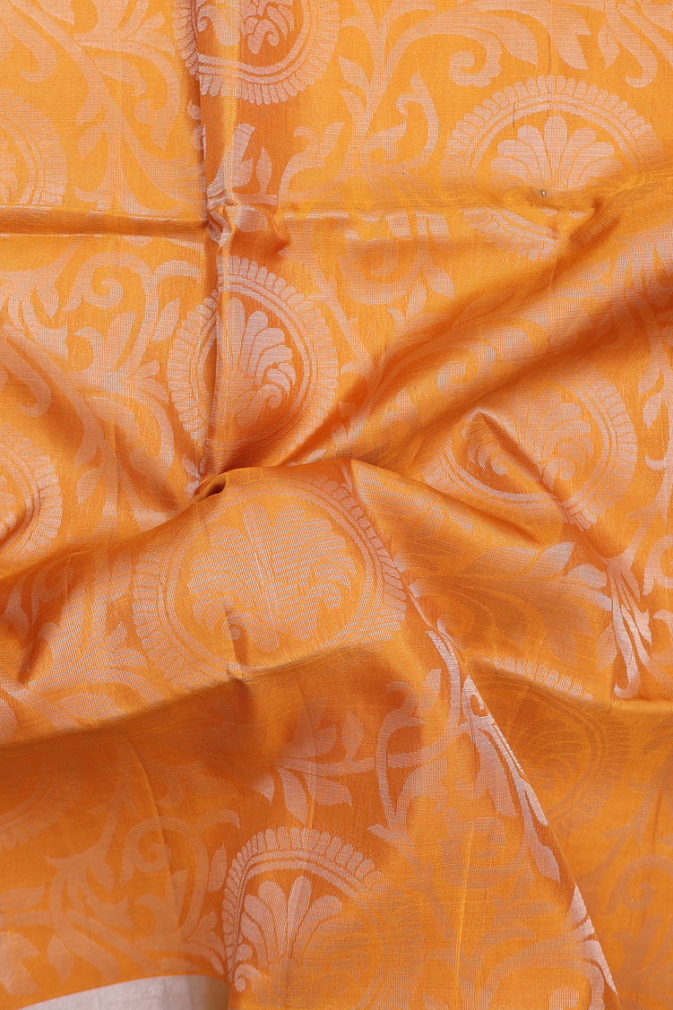 Elevate your traditional wardrobe with this soft silk saree in a rich ochre orange shade, adorned with delicate floral motifs. Its smooth texture and elegant drape make it perfect for festive occasions or formal events. The subtle floral design adds a refined touch, enhancing your graceful silhouette with every wear.