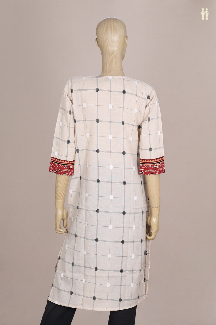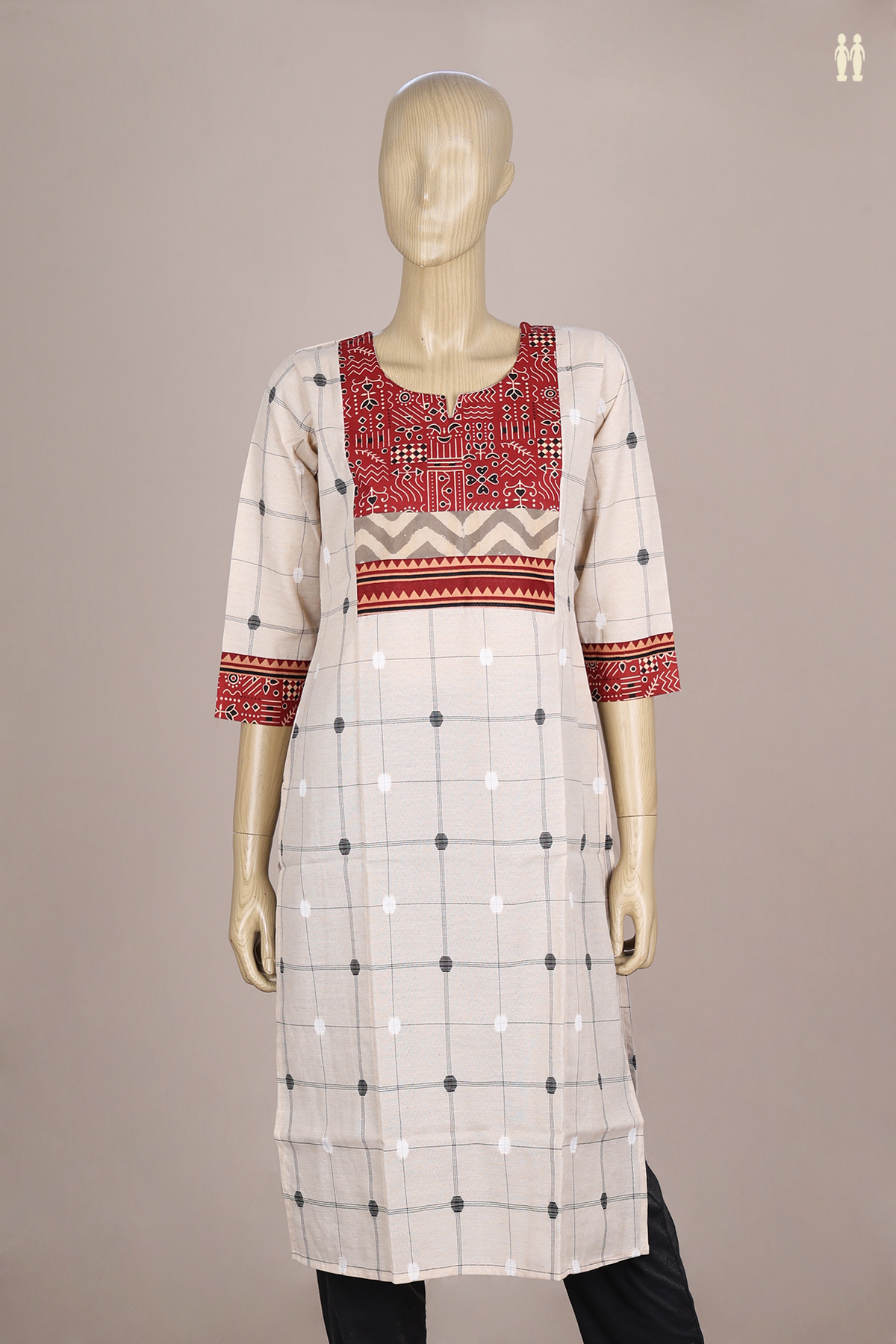 Elevate your wardrobe with this beige cotton long kurta featuring a refined split neck and subtle checks design. Crafted from breathable cotton, it offers comfort and elegance for everyday wear or special occasions. The timeless pattern and tailored fit make it a versatile choice for a sophisticated, polished look.