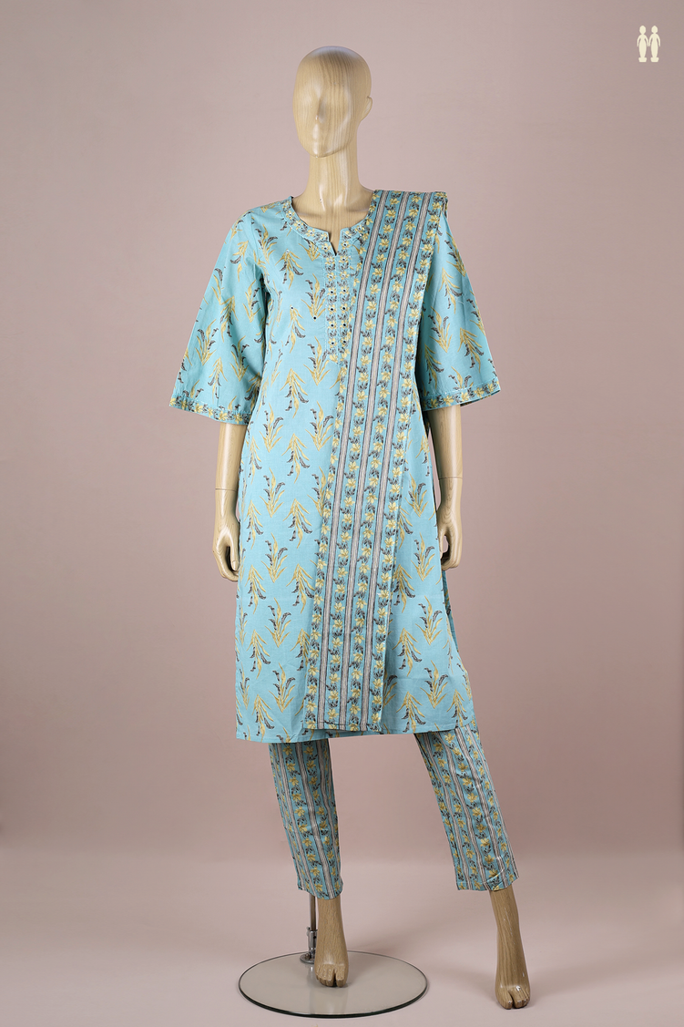 Elevate your ethnic wardrobe with this Split Neck Floral Design Salwar Set in a serene Turkish blue shade. Crafted from breathable cotton fabric, it ensures comfort throughout the day while the delicate floral patterns add a refined touch. The elegant split neck design perfectly balances tradition with modern style, making it ideal for festive occasions or casual gatherings. Experience effortless sophistication and timeless charm in this beautifully tailored ensemble.