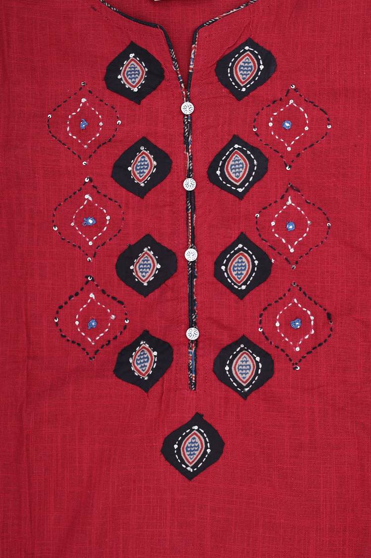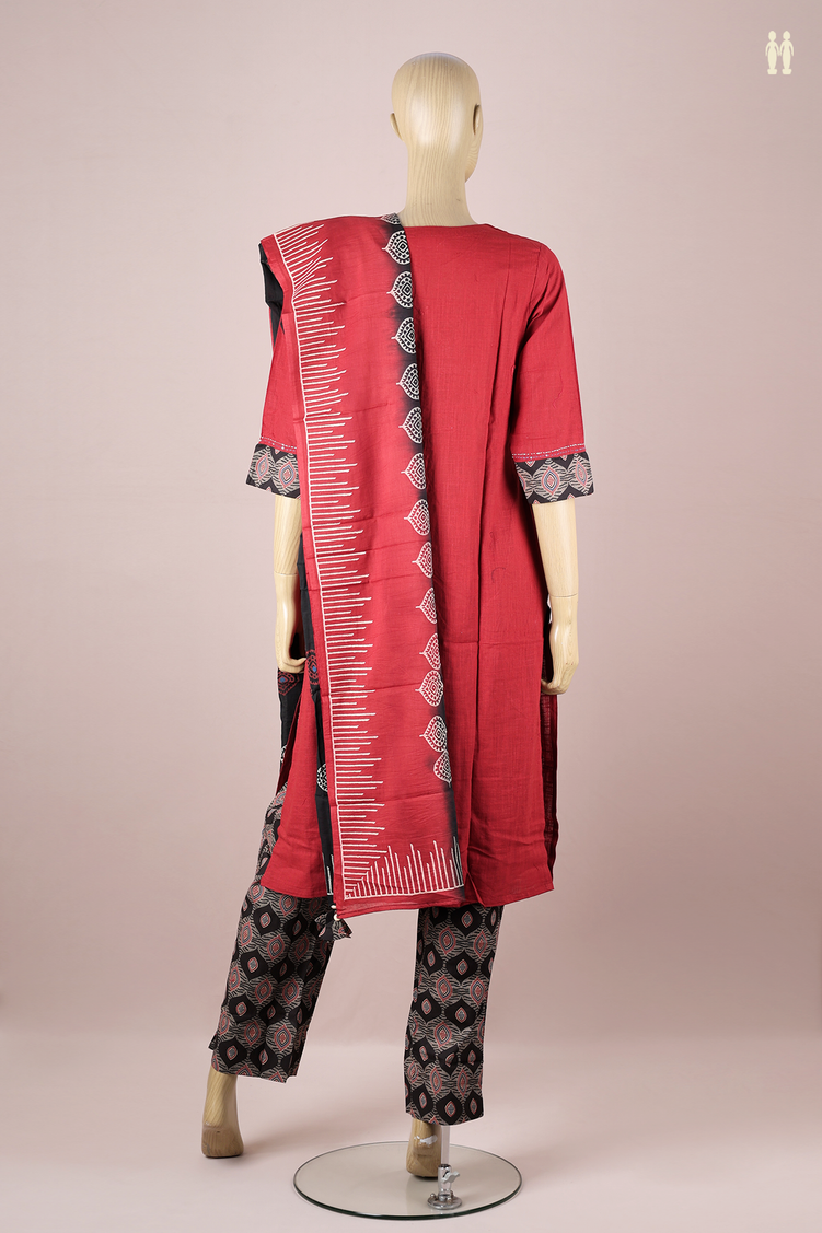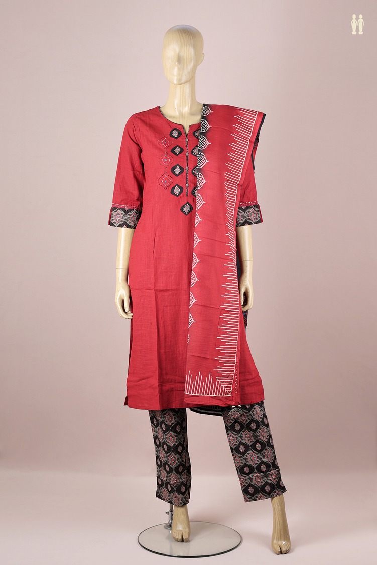 Embrace elegance with this split neck ogee design red cotton salwar set. Crafted from breathable cotton, it ensures comfort throughout the day while the refined ogee pattern adds a touch of timeless sophistication. Perfect for both casual gatherings and festive occasions, this set offers a graceful silhouette and effortless style.