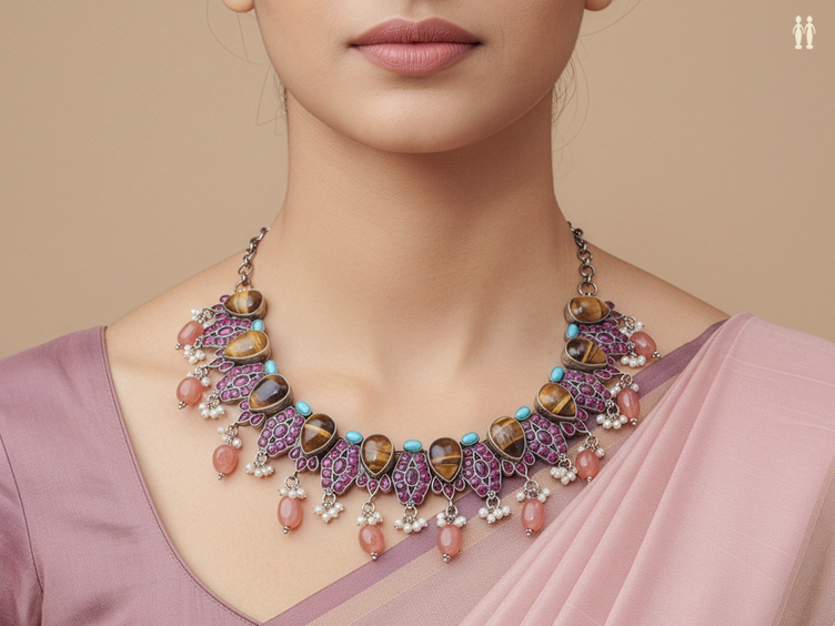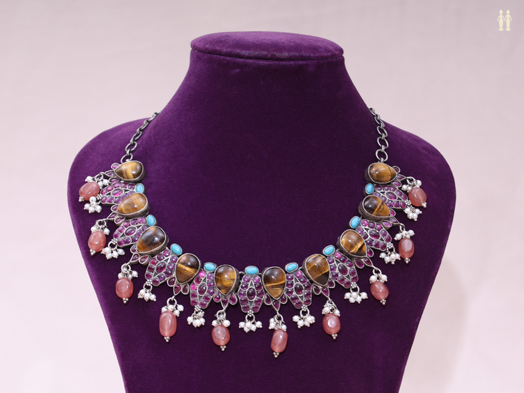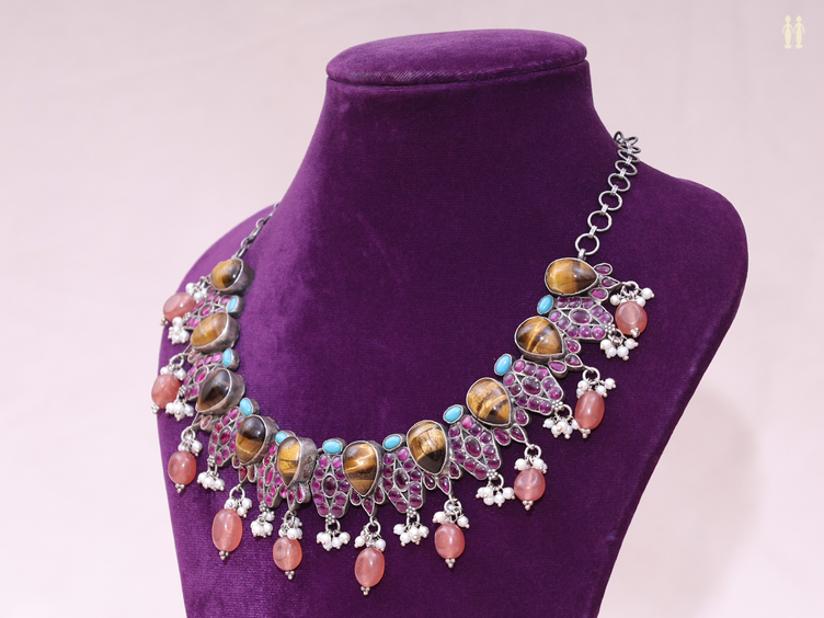 Tiger Eye Semi Precious Stone Oxidized Pure Silver Necklace