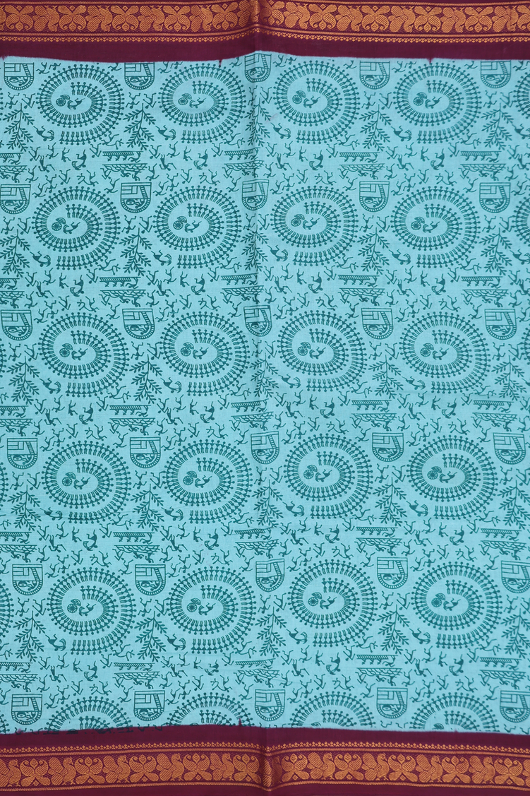 Sungudi Cotton Saree In Turkish Blue With Printed Design