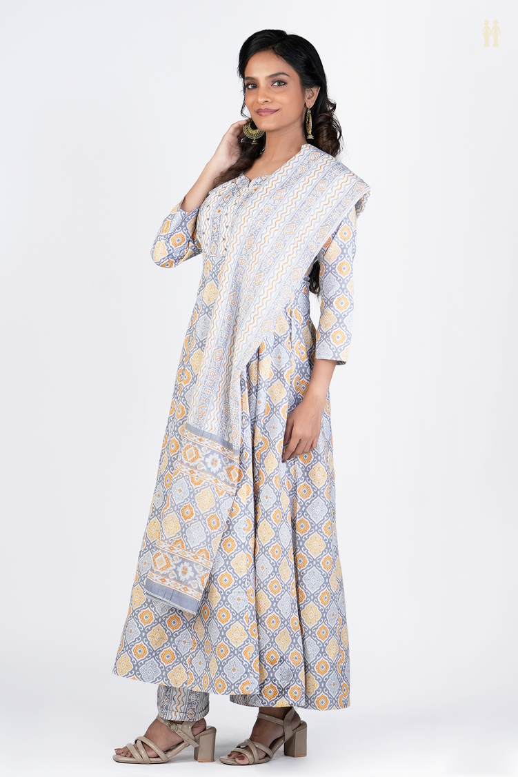 Sweet Heart Neck Printed Design Grey Cotton Salwar Set