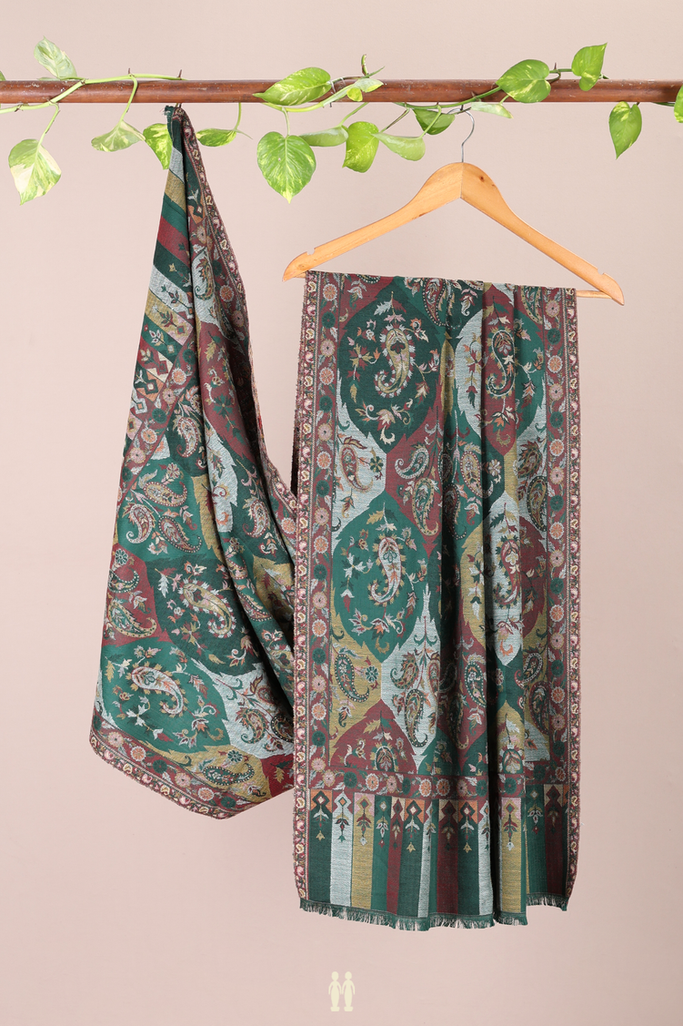Elevate your ensemble with this exquisite green woolen cotton shawl, adorned with intricate threadwork that reflects refined craftsmanship. Its soft, breathable blend offers warmth and comfort, making it perfect for cooler days while maintaining an elegant silhouette. A versatile accessory that enhances both traditional and contemporary outfits with a subtle yet striking appeal.