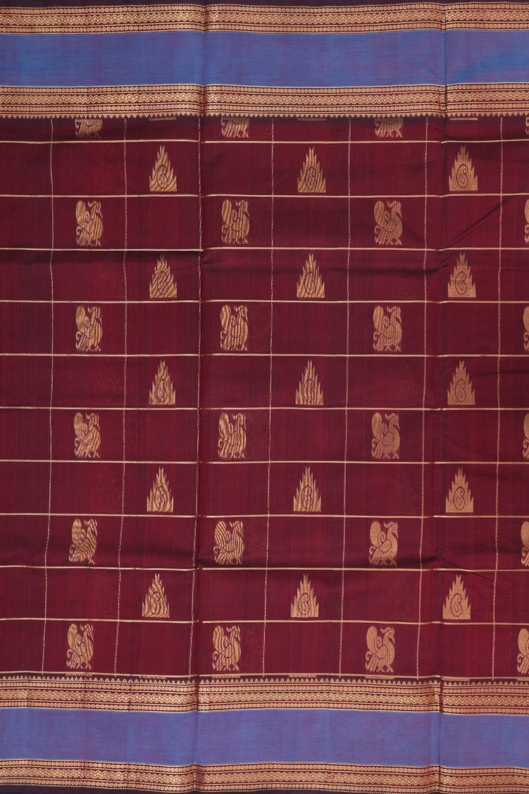 Traditional Silk Cotton Saree In Maroon With Checks Design