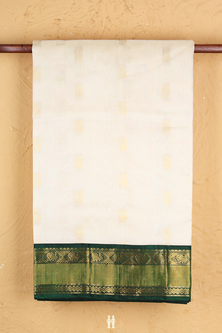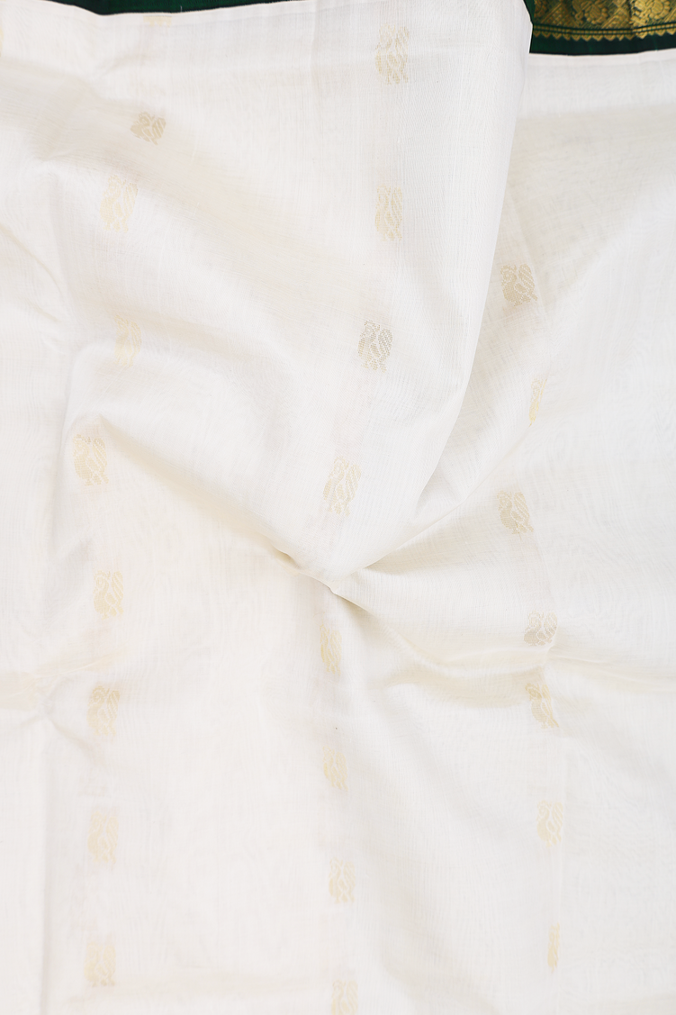 Traditional Silk Cotton Saree In White With Peacock Buttas