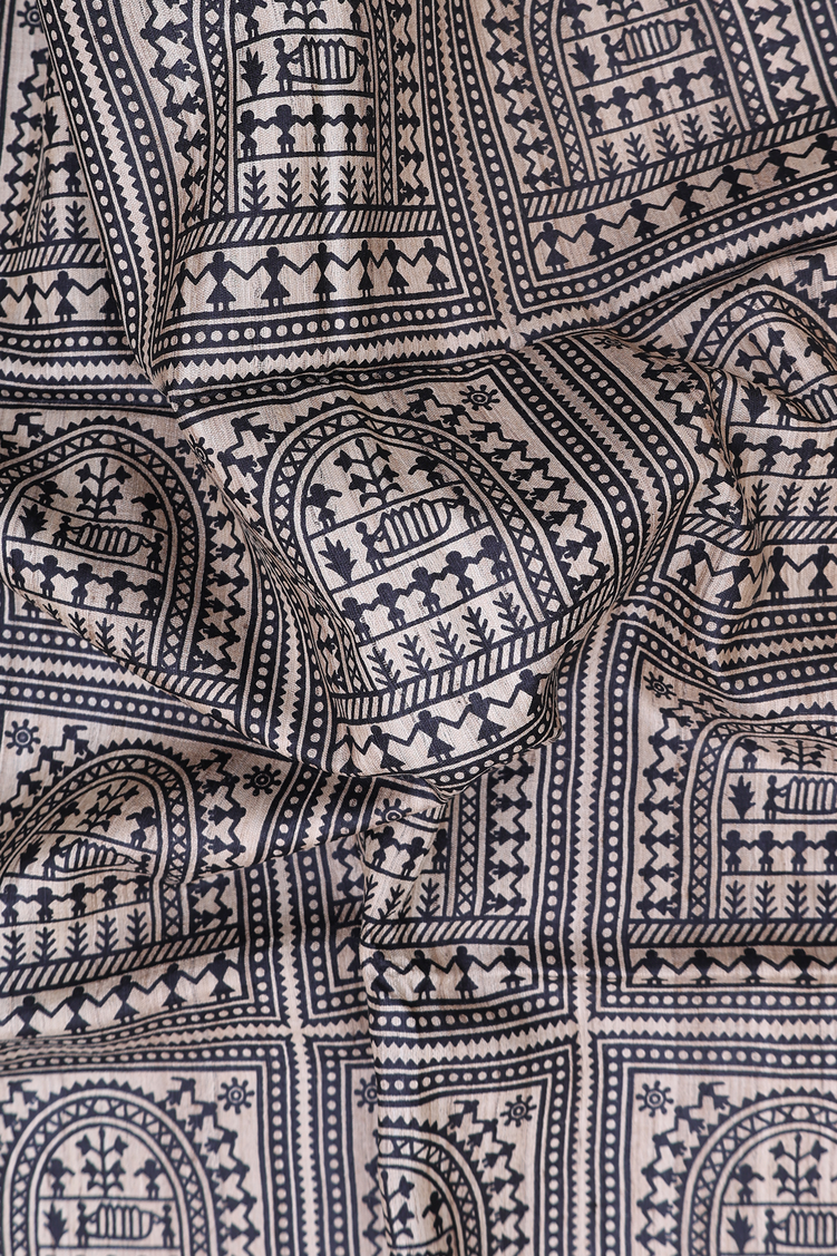 Tussar Madhubani Silk Saree Charcoal Grey With Printed Design