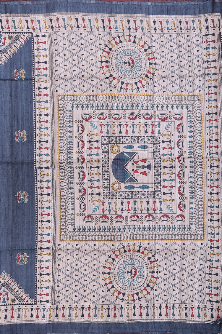 Tussar Madhubani Silk Saree In Aegean Blue With Warli Design