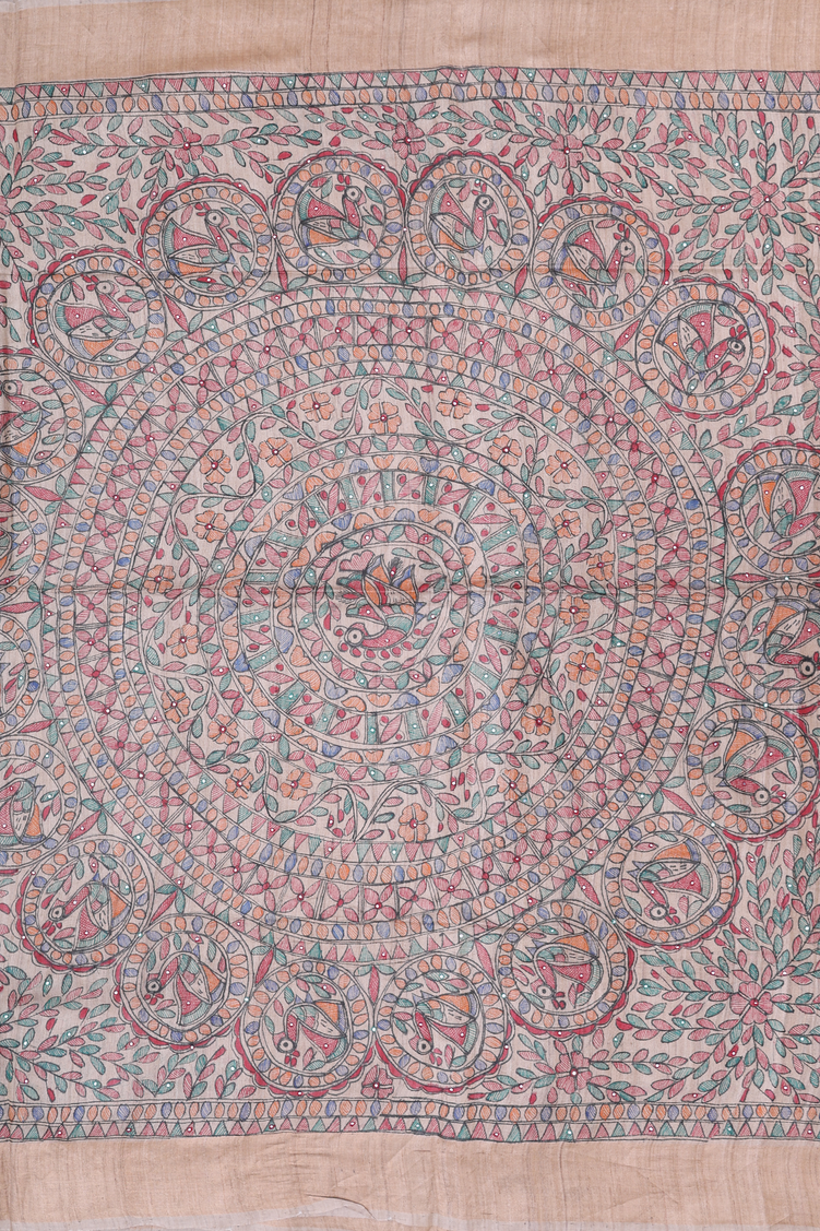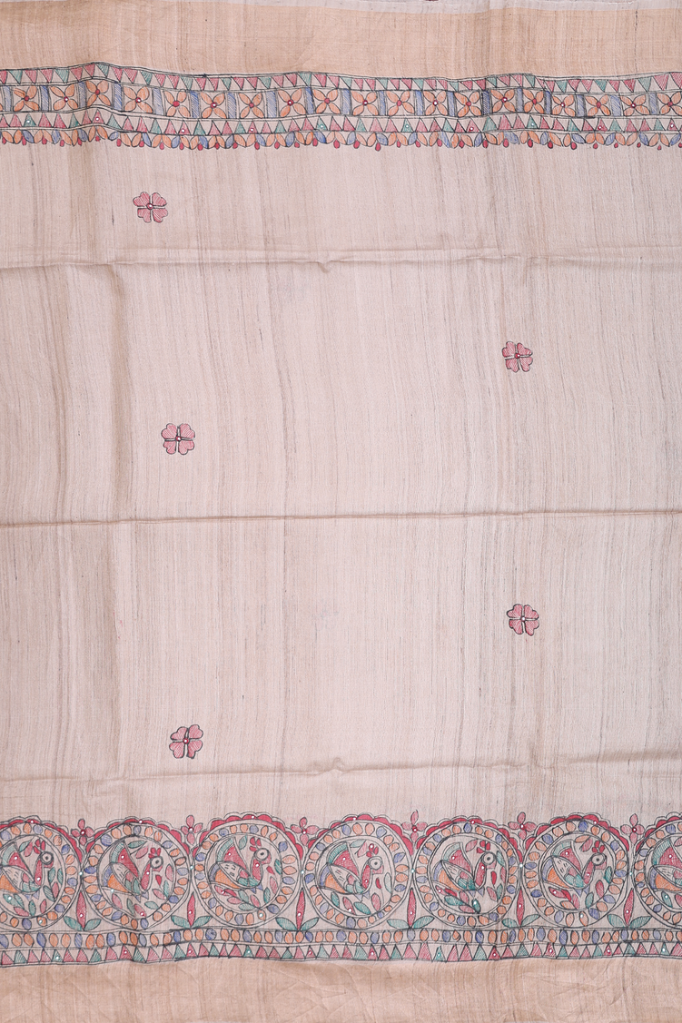 Tussar Madhubani Silk Saree In Beige With Floral Buttas