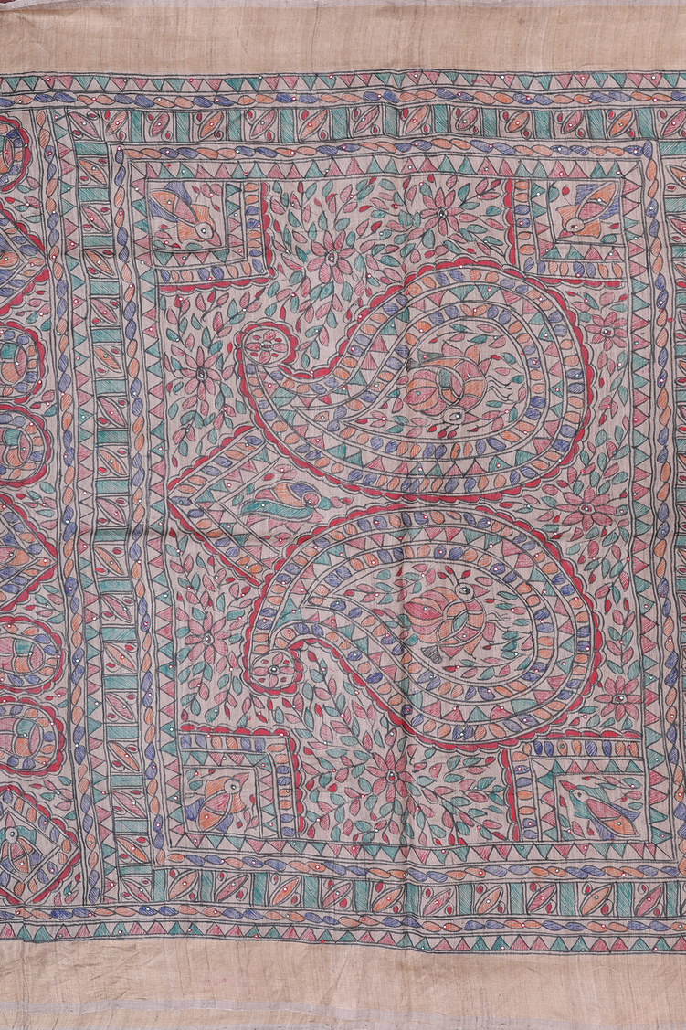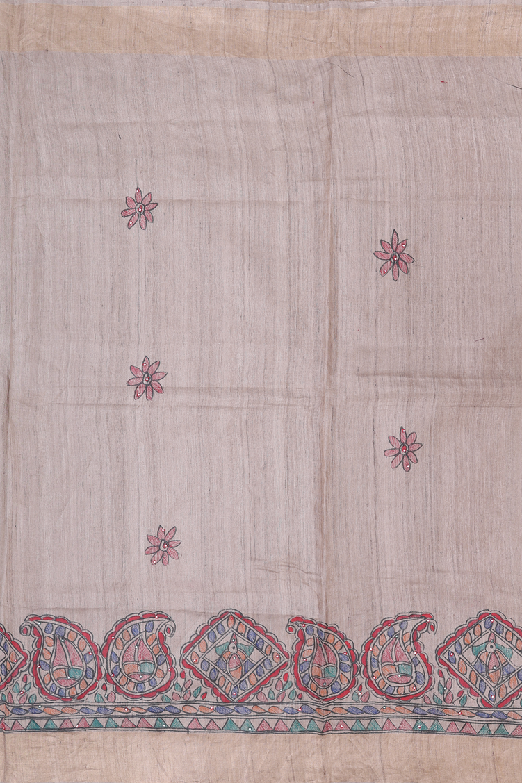 Tussar Madhubani Silk Saree In Beige With Floral Buttas