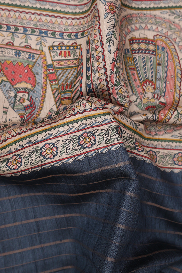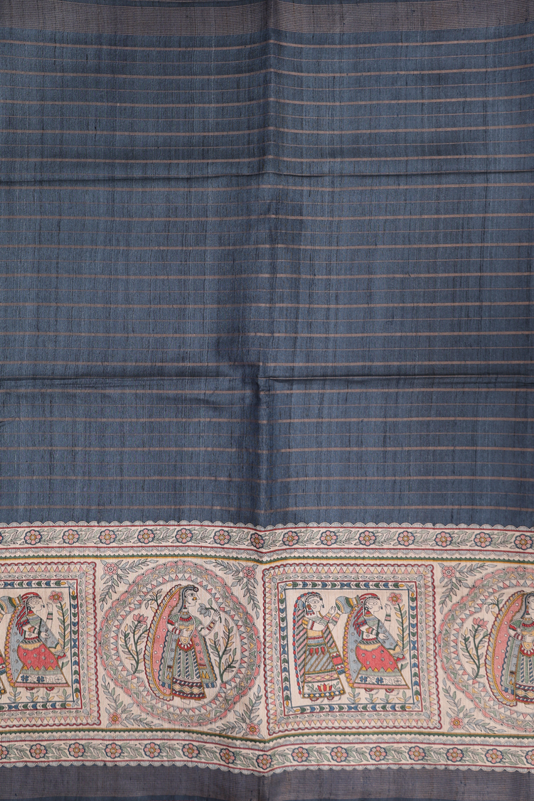 Tussar Madhubani Silk Saree In Blue With Stripes Design