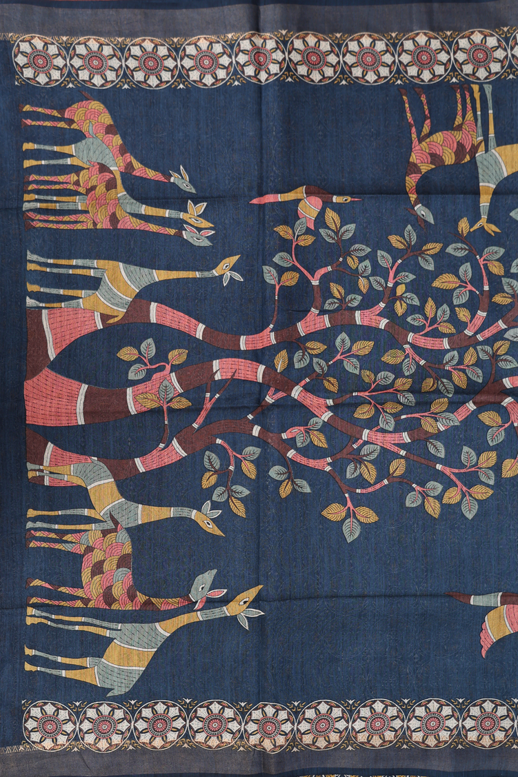 Tussar Madhubani Silk Saree In Capri Blue With Deer Design