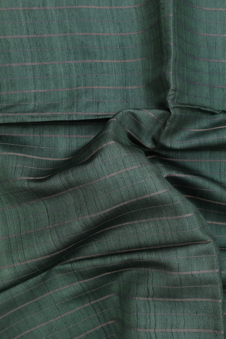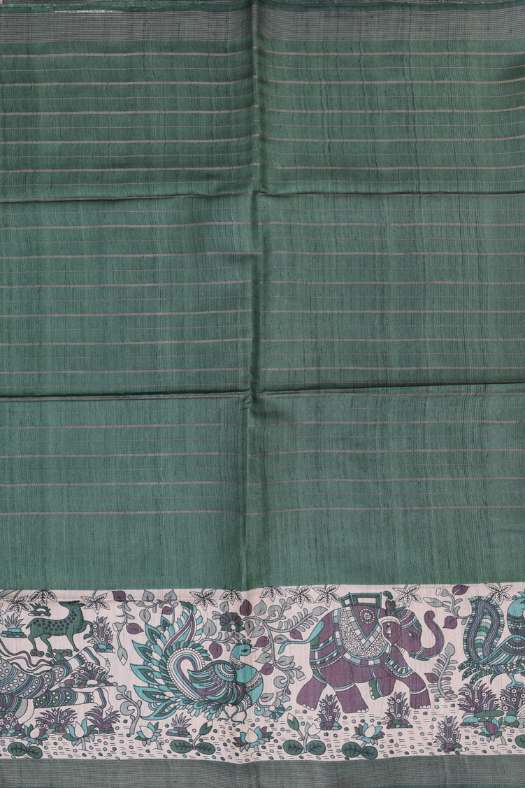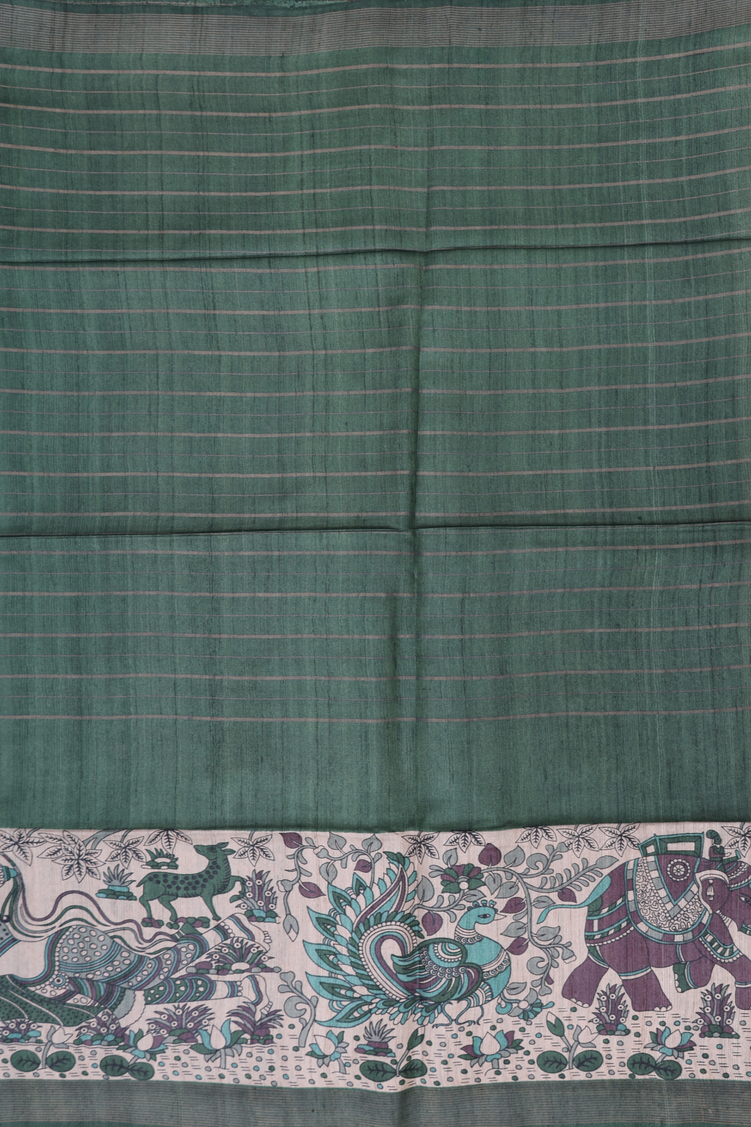 Tussar Madhubani Silk Saree In Green With Stripes Design