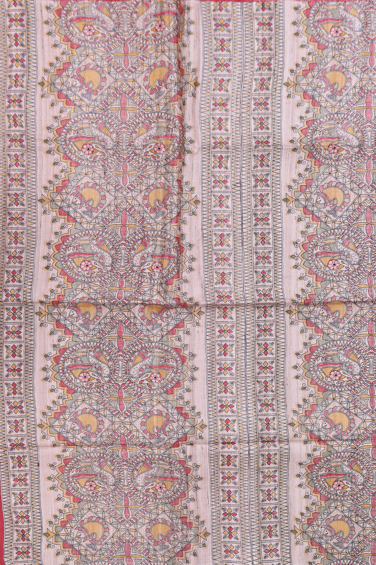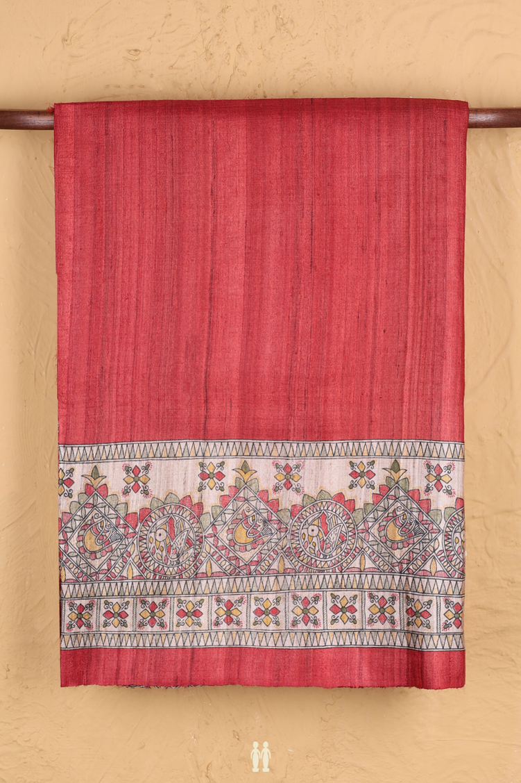 Tussar Madhubani Silk Saree In Red With Contrast Border