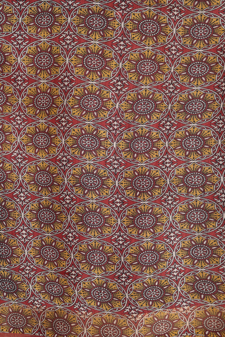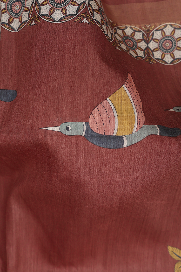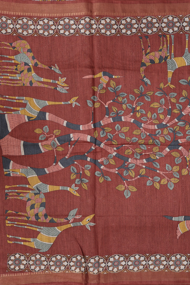 Tussar Madhubani Silk Saree In Rust Red With Deer Design