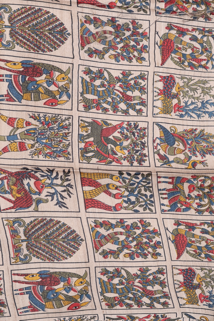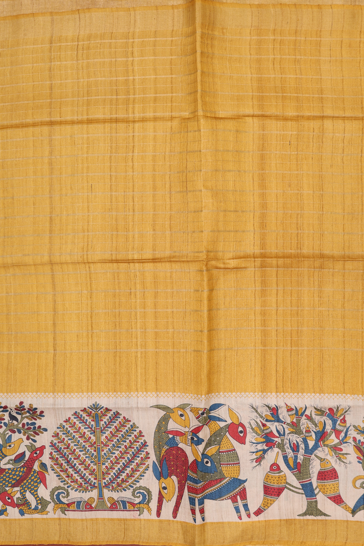 Tussar Madhubani Silk Saree In Yellow With Stripes Design