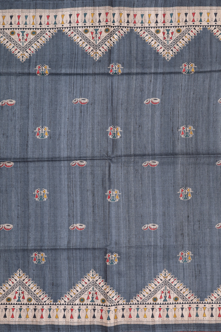 Tussar Madhubani Silk Saree In Aegean Blue With Warli Design