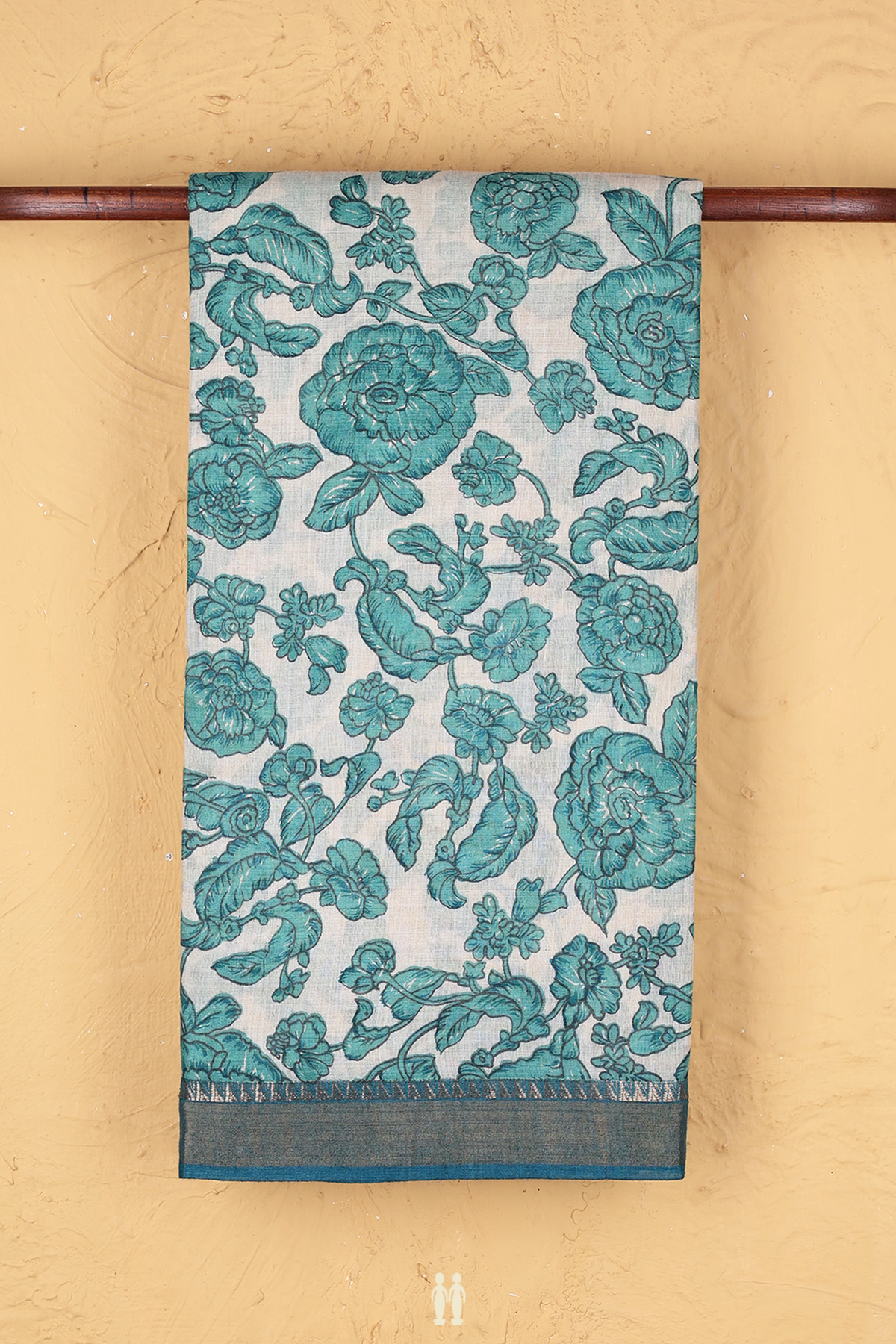 Elevate your ethnic wardrobe with this exquisite tussar silk saree in soft beige, adorned with delicate floral motifs with contrast teal blue pallu and blouse. Tussar silk's natural texture and subtle sheen create an understated elegance perfect for both festive occasions and refined everyday wear. The intricate floral design adds visual interest while maintaining a timeless aesthetic.Â