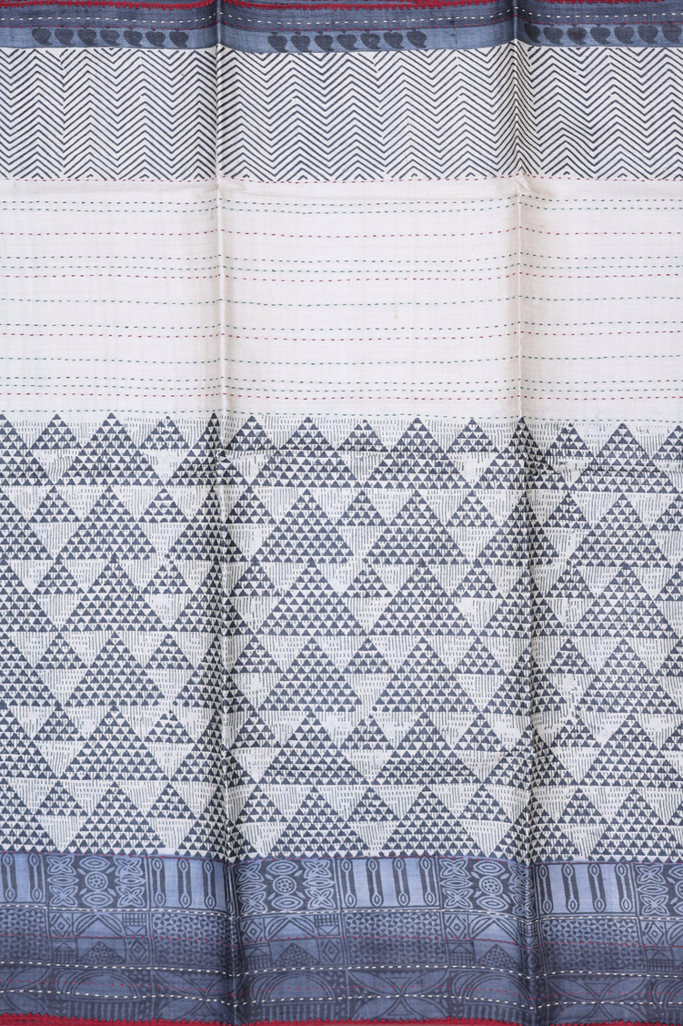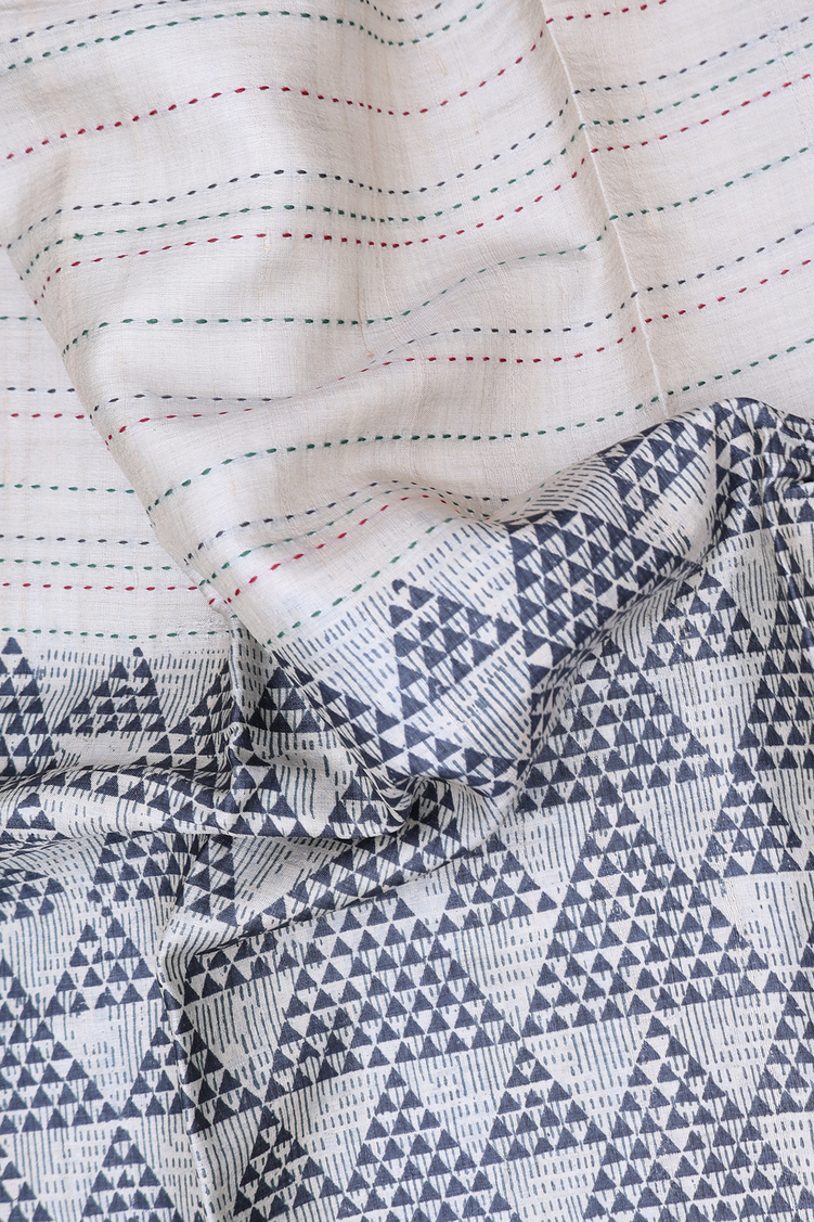 Elevate your elegance with this beige tussar silk saree, adorned with a subtle triangle design that adds refined texture and visual interest. The natural sheen of tussar silk offers a graceful drape, making it perfect for formal occasions and cultural celebrations. Experience the timeless charm of traditional craftsmanship combined with understated sophistication.
