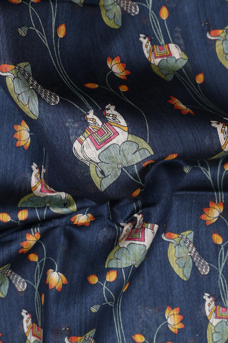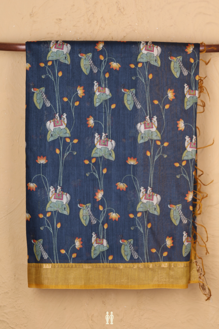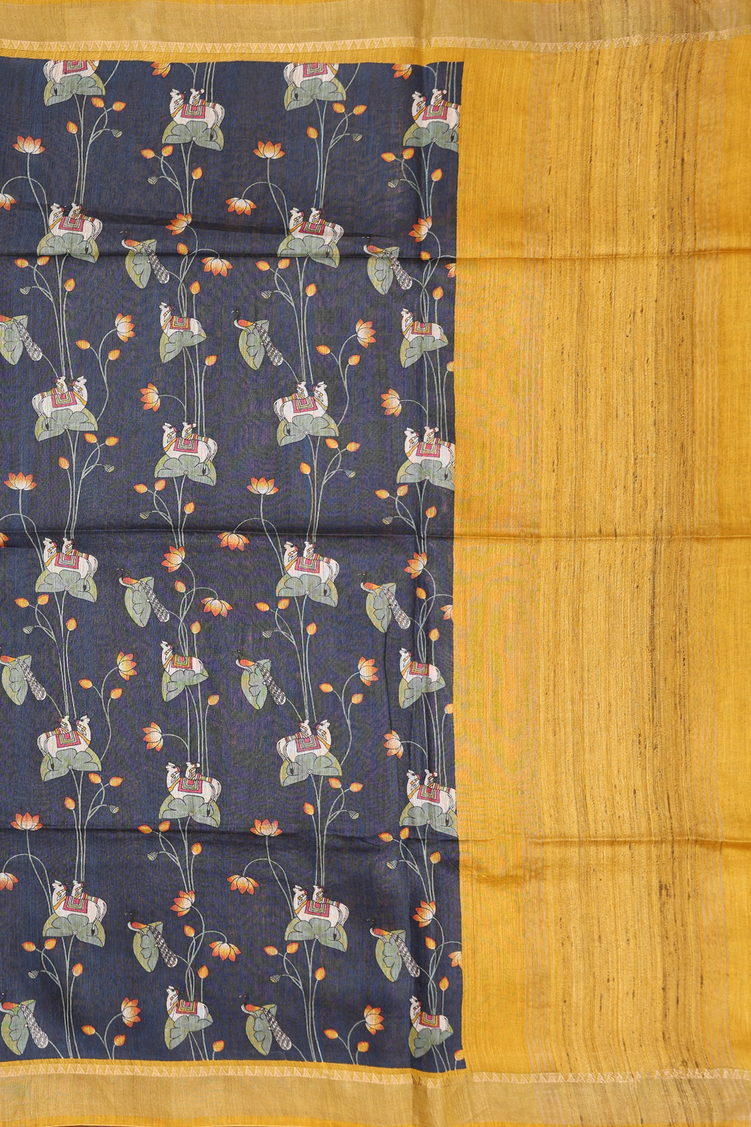 Tussar Silk Saree In Blue With Cow And Floral Printed Design