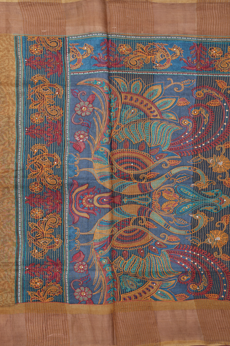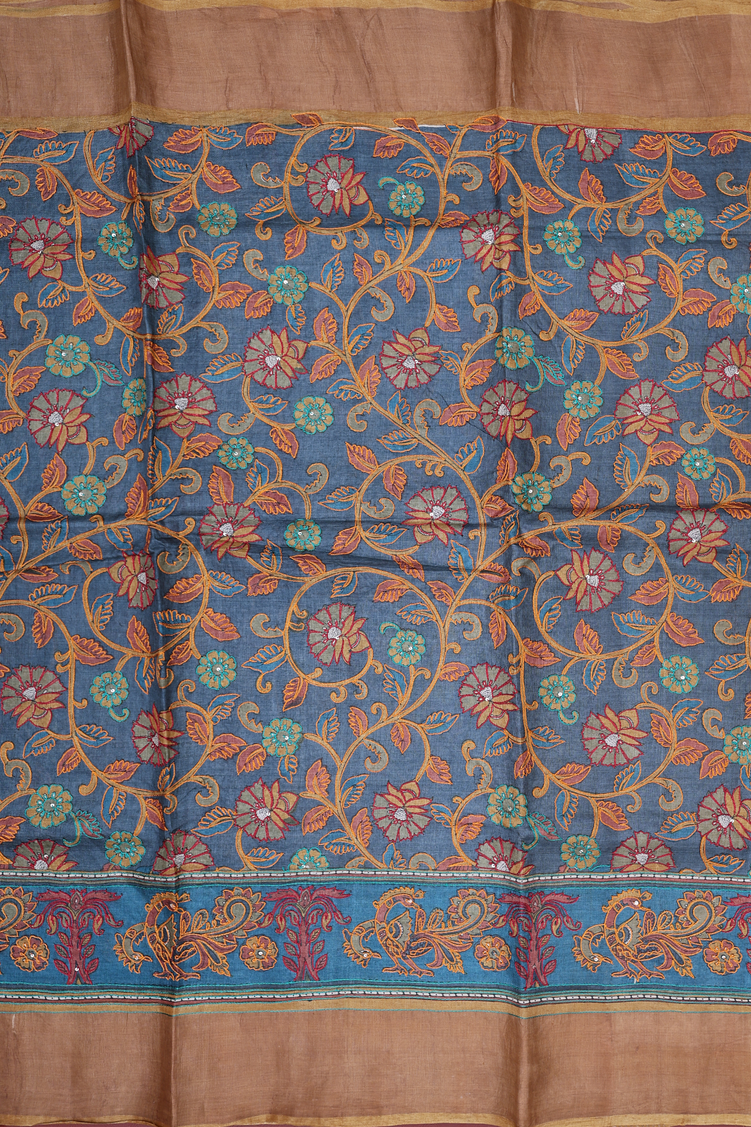 Tussar Silk Saree In Blue With Floral Embroidered Design