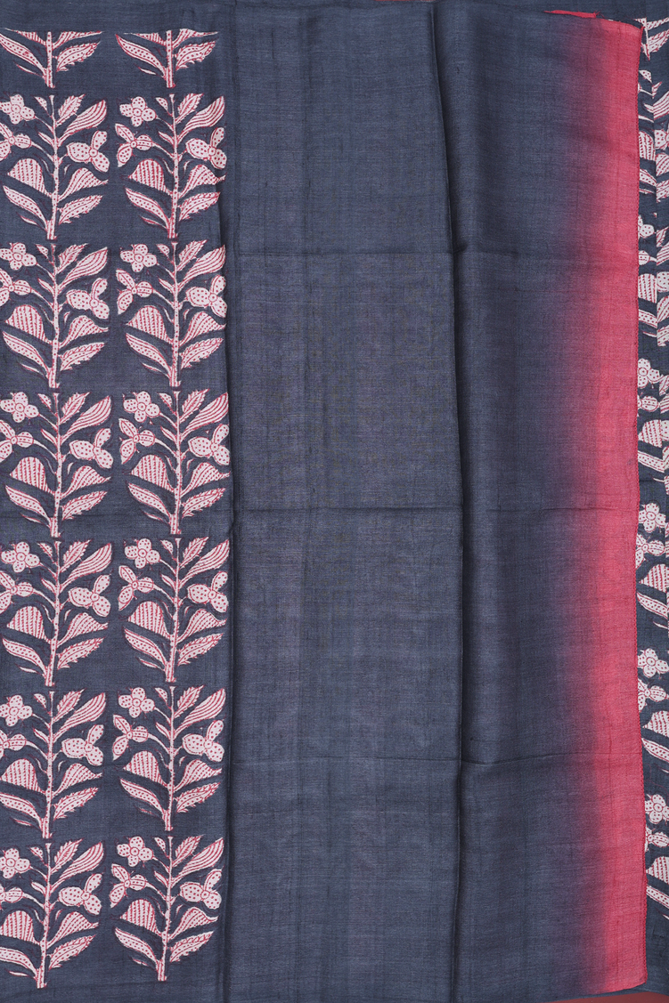 Tussar Silk Saree In Charcoal Grey With Floral Design