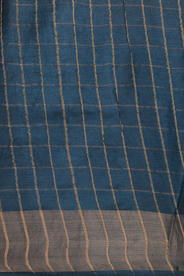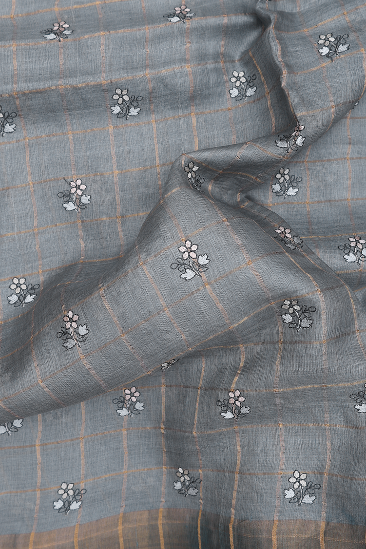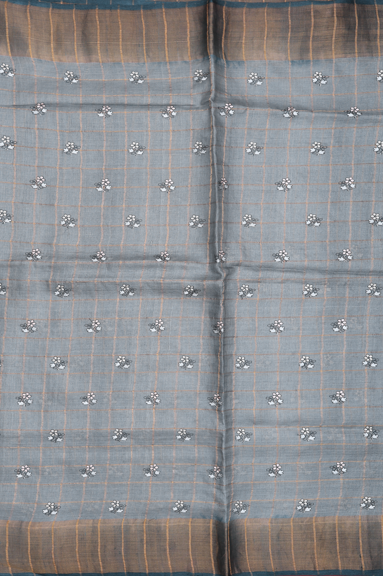 Tussar Silk Saree In Greenish Grey With Checks Design