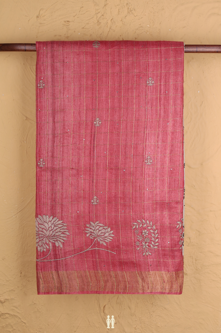 Elevate your elegance with this tussar silk saree in a delicate pink shade, featuring a timeless checks design. Crafted from premium tussar silk, it offers a graceful drape and subtle sheen, perfect for refined occasions. The classic pattern adds a touch of sophistication, making it an ideal choice for those who appreciate understated luxury.