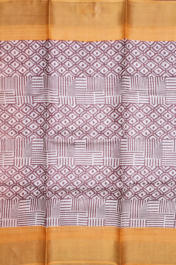 Elevate your elegance with this tussar silk saree in a rich plum brown hue. Featuring an intricate allover printed design, this saree marries traditional craftsmanship with contemporary style. Its natural silk texture offers a graceful drape and subtle sheen, perfect for formal occasions or festive celebrations. Experience timeless sophistication in every fold.