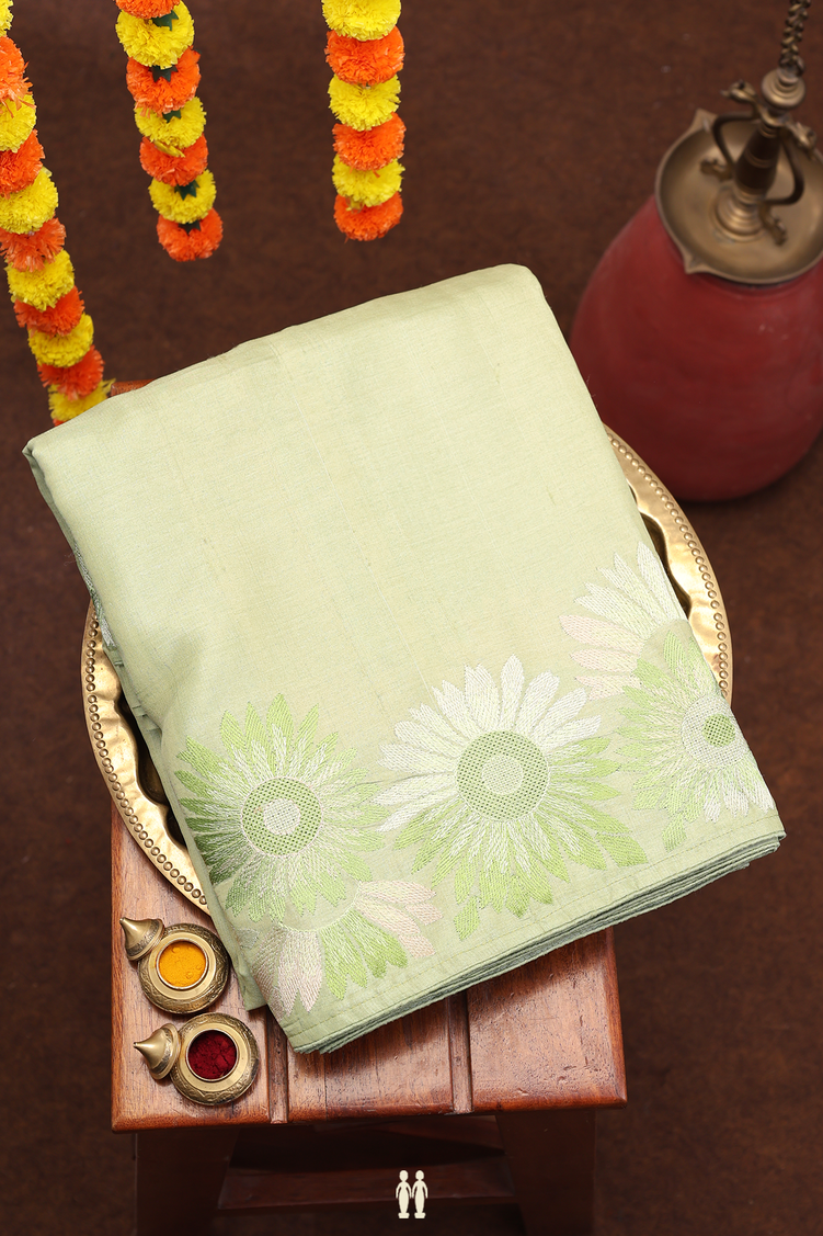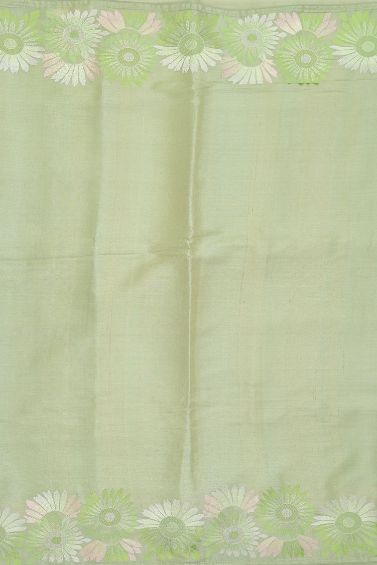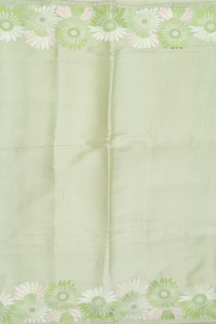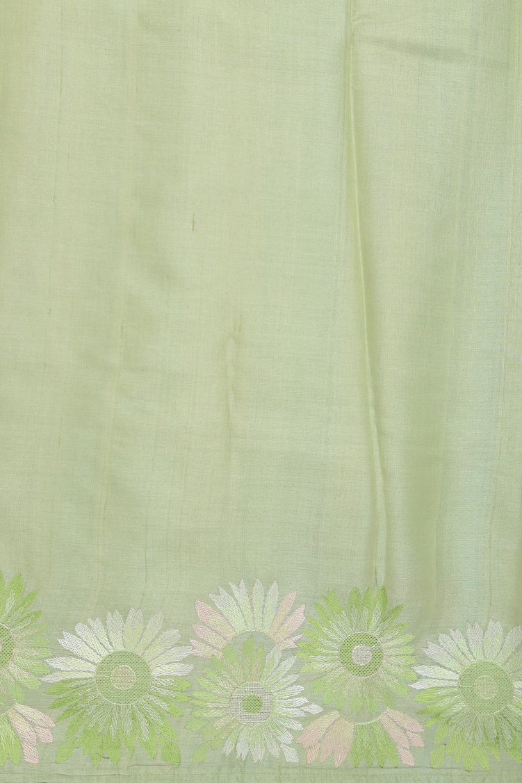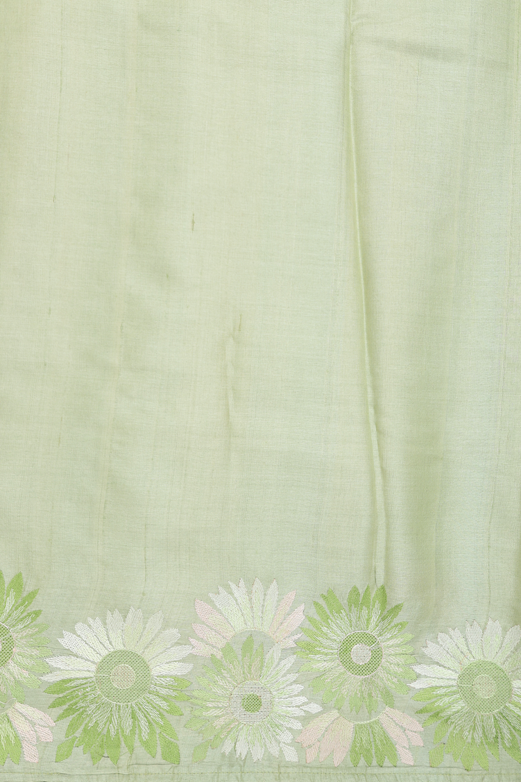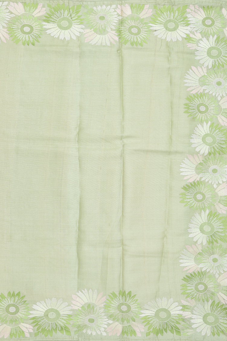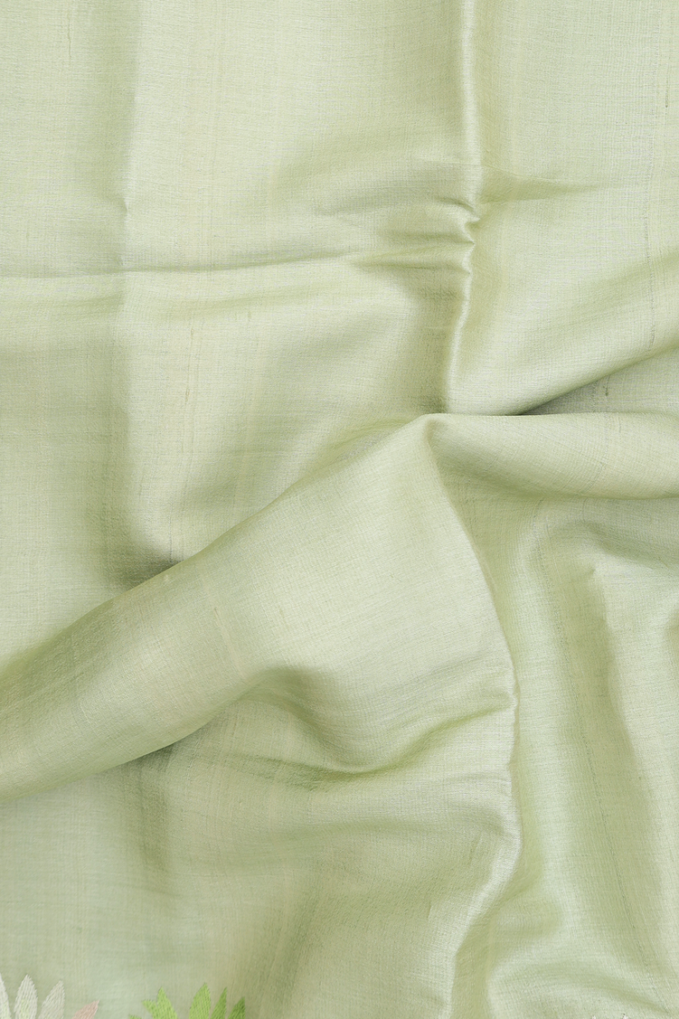 Elevate your elegance with this tussar silk saree in a serene sage green shade, accentuated by a delicate floral border. The natural texture of tussar silk lends a subtle sheen and breathable comfort, making it ideal for both festive occasions and refined gatherings. Its understated yet graceful design offers timeless sophistication that enhances your presence effortlessly.