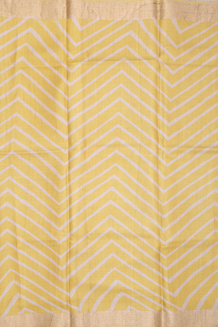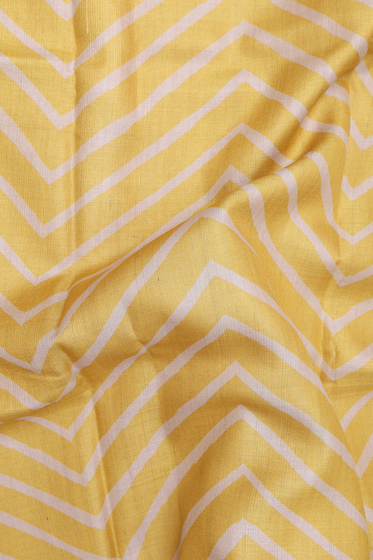 Elevate your elegance with this yellow tussar silk saree featuring a refined chevron design. Crafted from natural tussar silk, its subtle texture and rich hue enhance your silhouette gracefully. Perfect for special occasions, this saree blends tradition with sophisticated style, offering both comfort and timeless charm.
