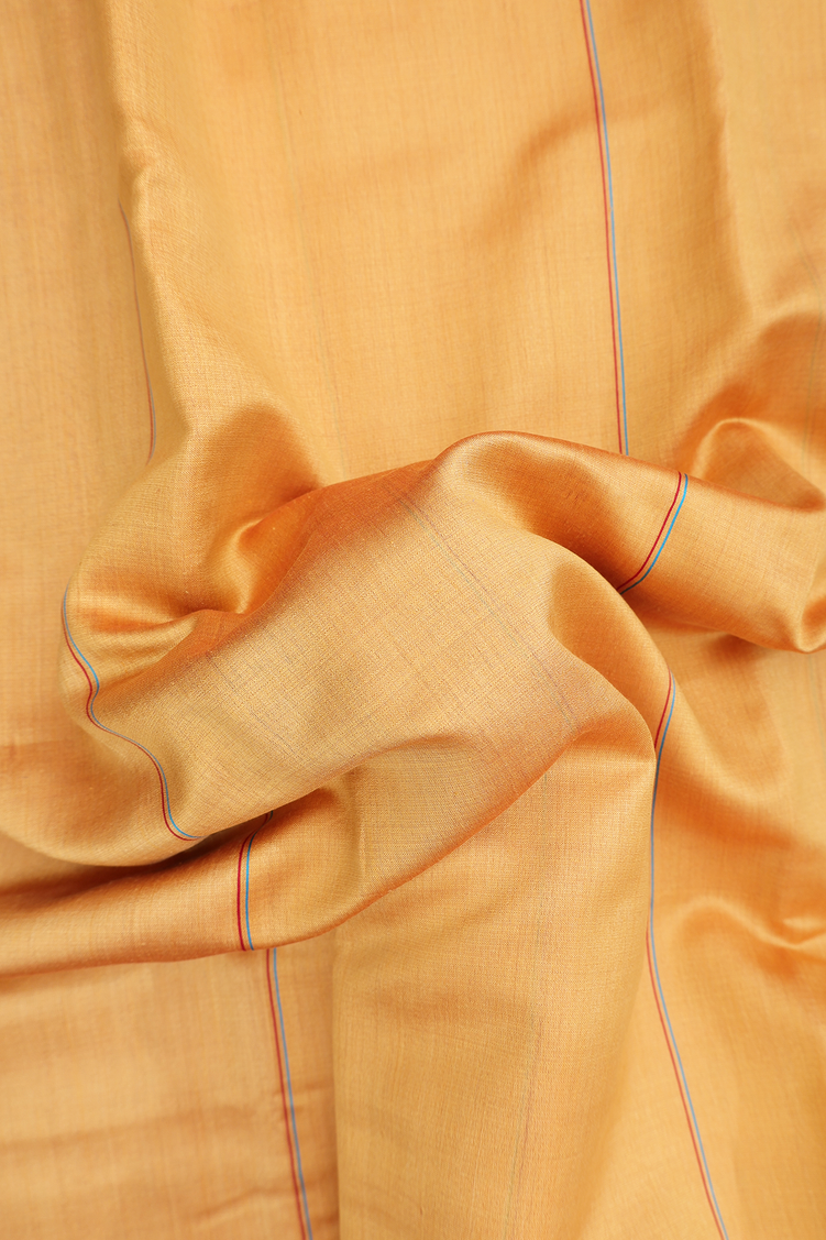 Elevate your elegance with this ahimsa tussar silk saree in a radiant yellow hue, adorned with subtle stripes that add refined texture. Crafted from ethically sourced tussar silk, it offers a graceful drape and a soft, natural sheen. Perfect for sophisticated occasions, this saree blends traditional craftsmanship with contemporary style, ensuring you stand out with understated charm.