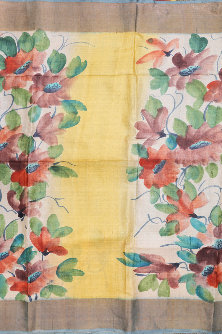Elevate your elegance with this yellow tussar silk saree, adorned with delicate floral motifs. The natural texture of tussar silk combined with the subtle design offers a refined look perfect for formal occasions. Its lightweight drape ensures comfort, while the vibrant yellow hue adds a touch of warmth and sophistication to your ensemble.