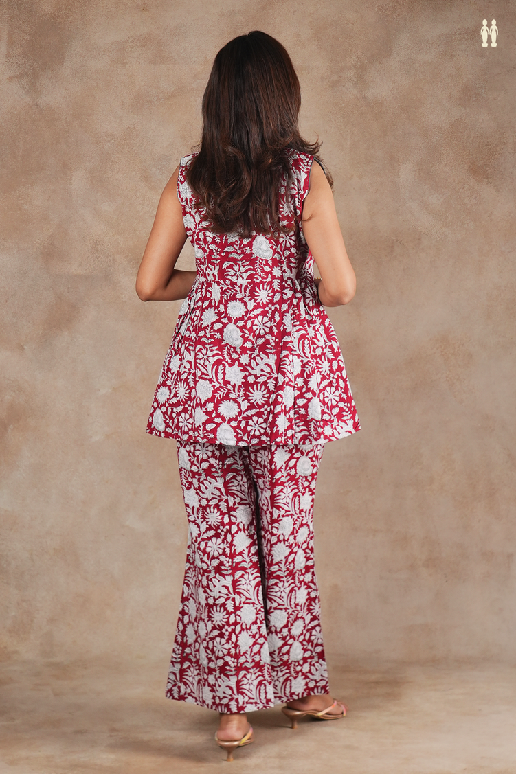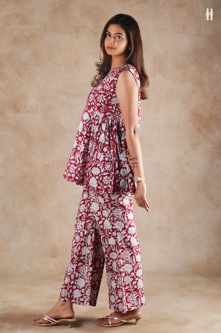 V-Neck Floral Design Red Cotton Top And Bottom Set