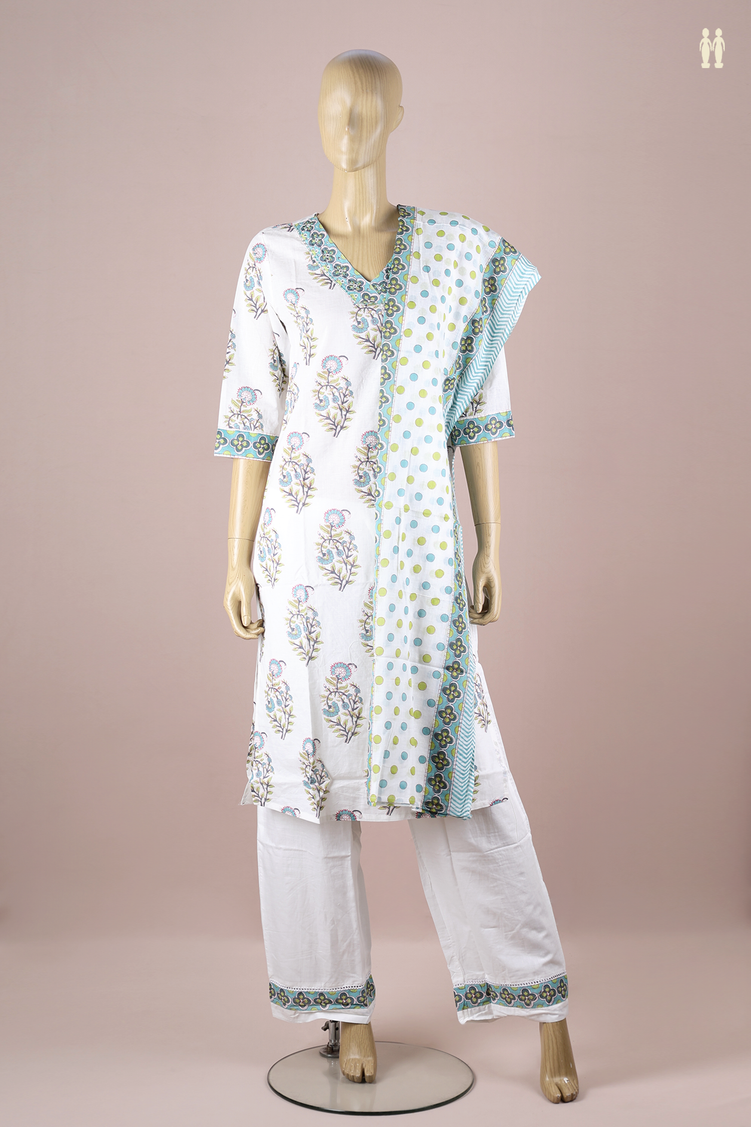 Embrace effortless elegance with this v-neck white cotton salwar set featuring a delicate floral design. Crafted from breathable cotton, it ensures comfort while maintaining a refined silhouette perfect for any occasion. The subtle floral pattern enhances its timeless appeal, making it a sophisticated choice for day-to-evening wear.