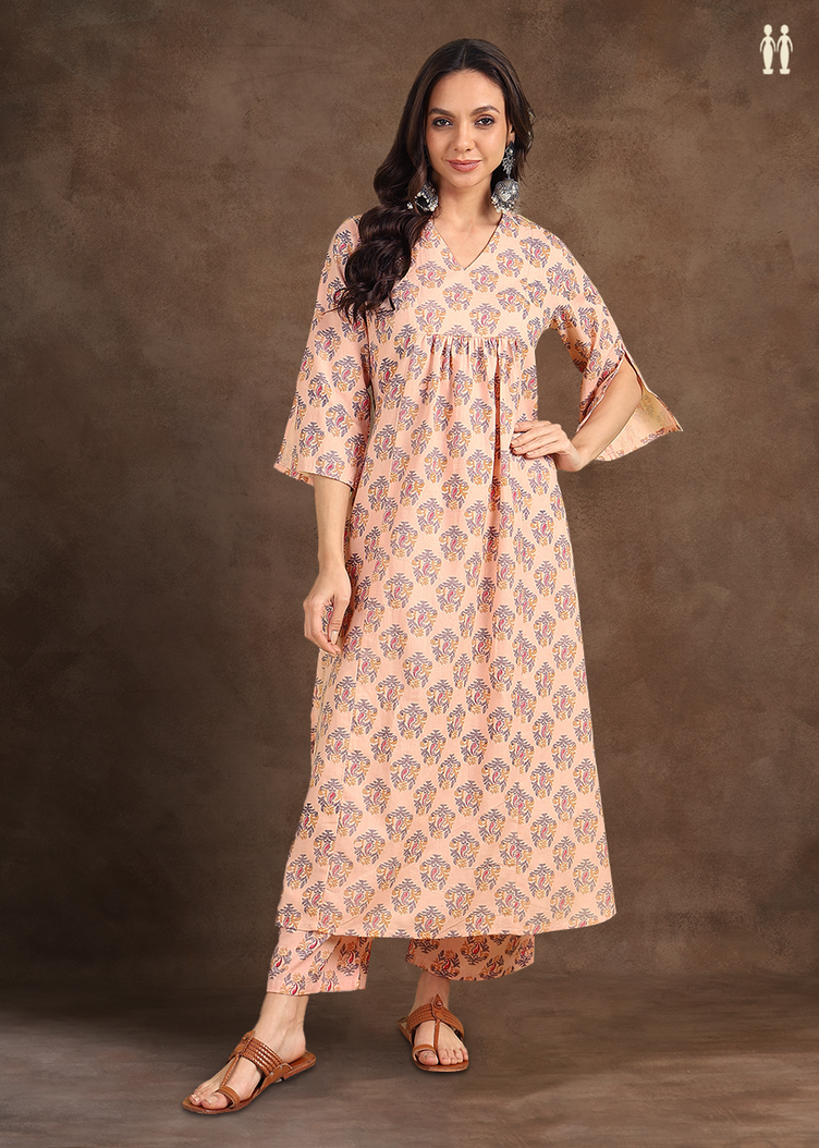 V-Neck Paisley Design Peach Pink Cotton Salwar Set
