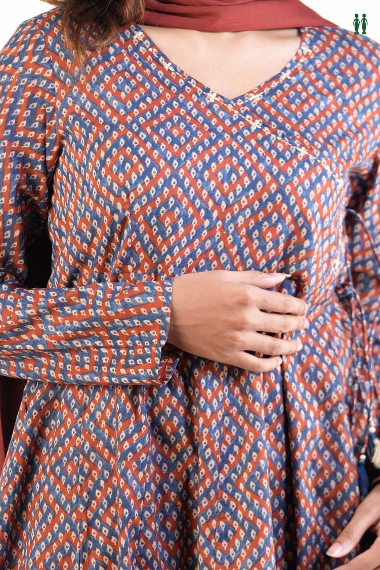 This v-neck printed blue and red cotton salwar set combines elegance with comfort. Crafted from soft cotton, it offers breathability and ease of movement, perfect for warm days. The tasteful blue and red print enhances its refined appeal, making it suitable for both casual outings and semi-formal occasions. Designed to provide a flattering fit, this set balances traditional charm with contemporary style effortlessly.