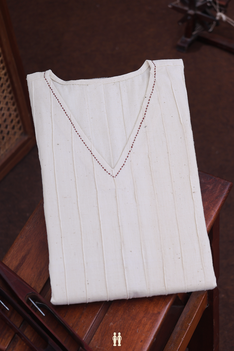 V-Neck Stripes Design Beige Handspun Cotton Long Kurta