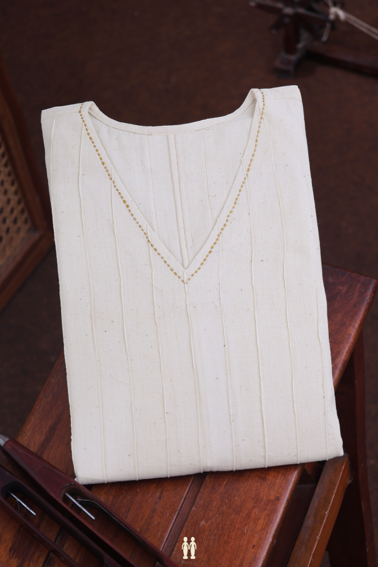 V-neck Stripes Design Beige Handspun Cotton Long Kurta