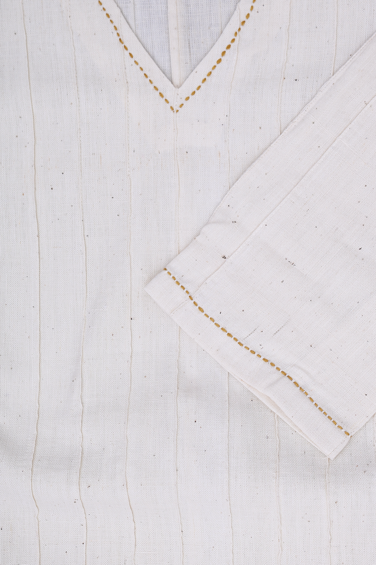 Elevate your wardrobe with this v-neck long kurta, crafted from handspun cotton in a subtle beige tone. Featuring refined stripes design, it offers a graceful silhouette and breathable comfort perfect for all-day wear. The natural texture and lightweight fabric bring an understated elegance, making it ideal for both casual outings and polished occasions.