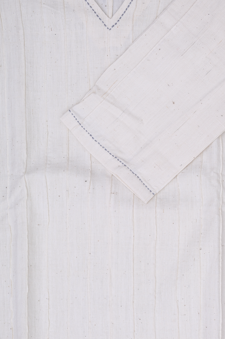 Experience understated elegance with this v-neck long kurta crafted from handspun cotton. Its beige base adorned with subtle stripes offers a refined look, while the breathable fabric ensures comfort throughout the day. Perfect for both casual and formal occasions, this kurta blends traditional craftsmanship with modern sophistication.
