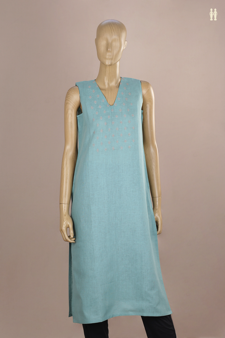 V-Neck Threadwork Buttas Turkish Blue Long Kurta